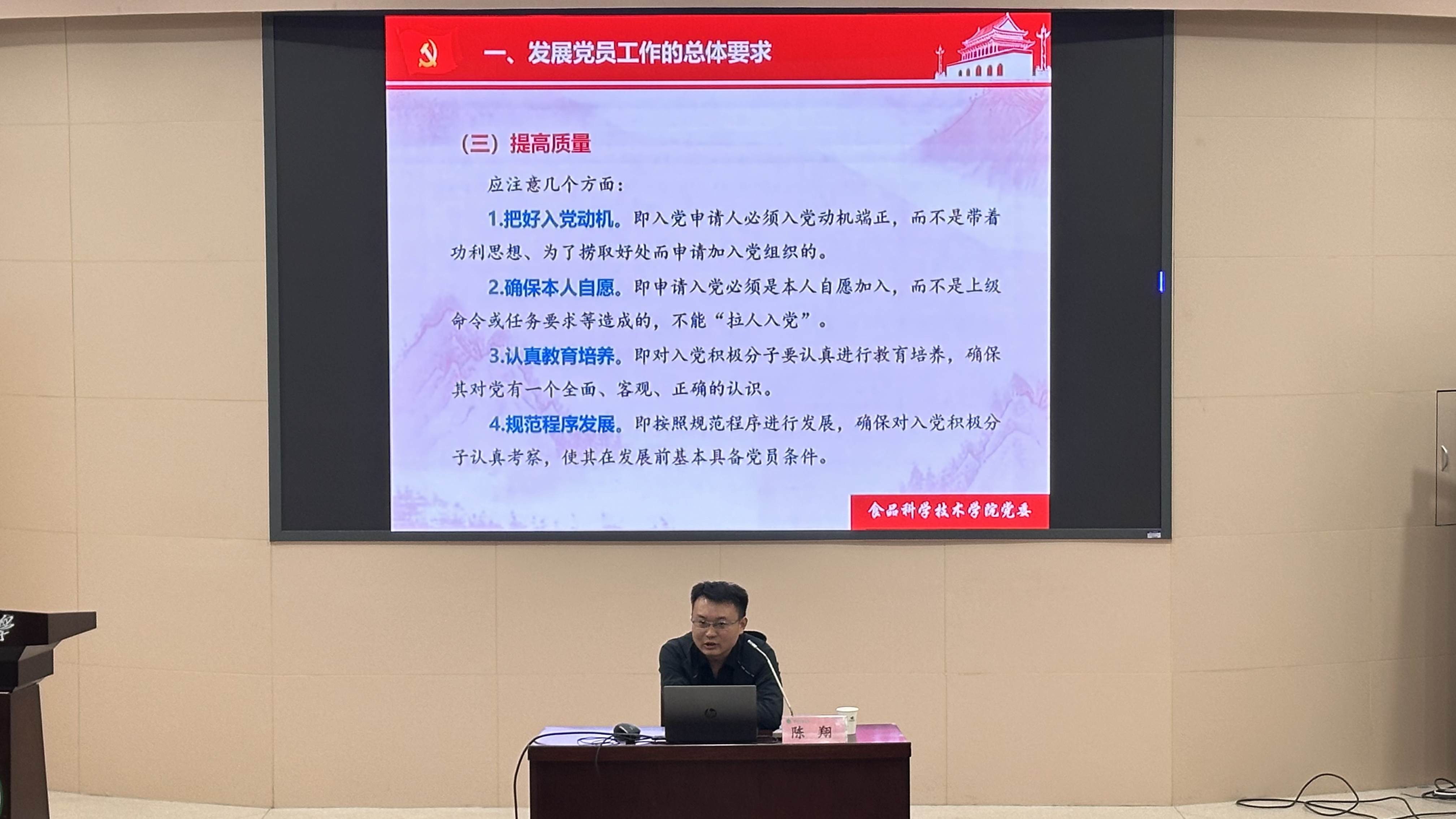 接着陈翔就发展党员的具体程序进行详细讲解,从入党积极分子的培养、考察,到预备党员的接收、转正等各个环节,进行细致的说明,并强调了在发展党员过程中必须坚持的原则和注意事项。在讲解的过程中,陈翔阐述了政治正确的重要性。他指出,在发展党员的整个过程中,政治素质是首要考量的因素,每一位党员都应当具备坚定的政治立场,对党的理论和路线方针政策有深刻的理解和认同。他提醒大家,入党不仅是荣誉,更是一份沉甸甸的责任,要求党员在任何时候都要以党的利益为重,自觉维护党的团结和统一。
