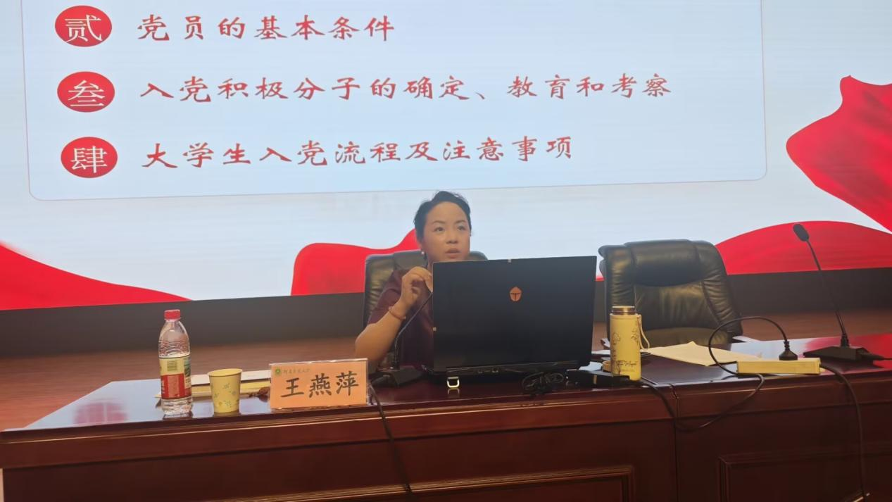 第六讲由外国语学院党委书记王燕萍讲授“中国共产党党员的条件和发展程序”专题。王书记深入讲解了党员发展工作的方针政策,强调要坚持党员标准,注重政治表现,确保发展党员工作的严肃性和规范性。同时,详细阐述了党员“先进分子”与“普通一员”的辩证关系,倡导入党积极分子们积极发挥先锋模范作用,用实际行动争取早日加入党组织。