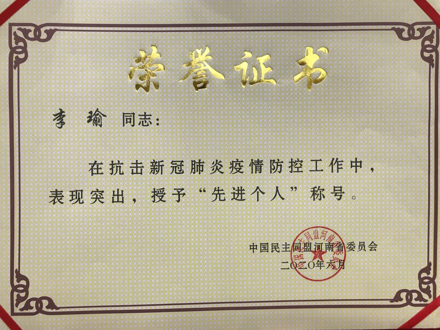 鉴于在疫情期间的突出表现,哔咔漫画 教师李瑜同志被民盟河南省委授予“抗疫先进个人”荣誉称号。