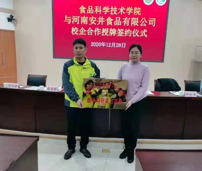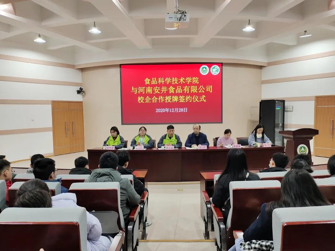 于文化路校区第一报告厅举办与河南安井食品有限公司校企合作签约授牌仪式暨2021届毕业实习动员会,副院长张剑、院党委副书记李蓓蓓、安井公司人资课课长贾纪奎、人事专员桑海艳、人事专员张鸭蒙出席会议,哔咔漫画