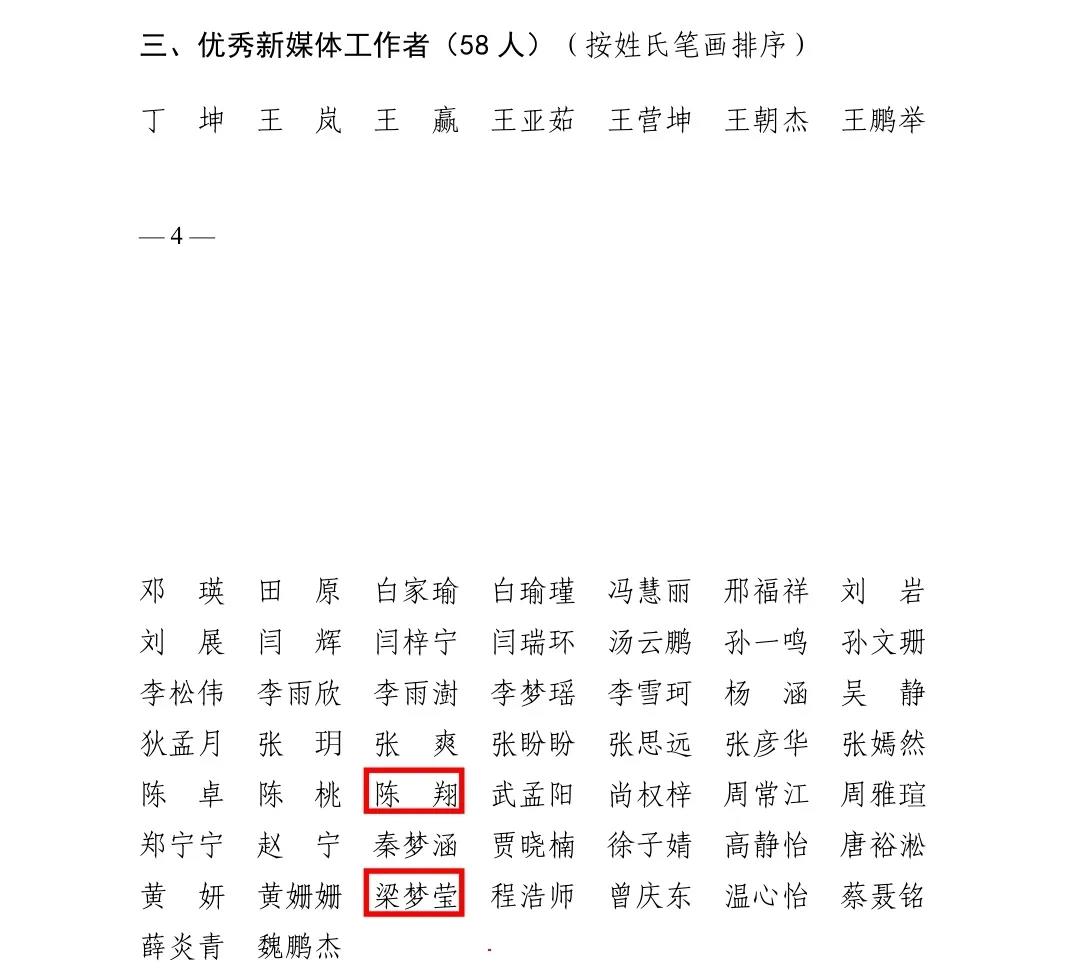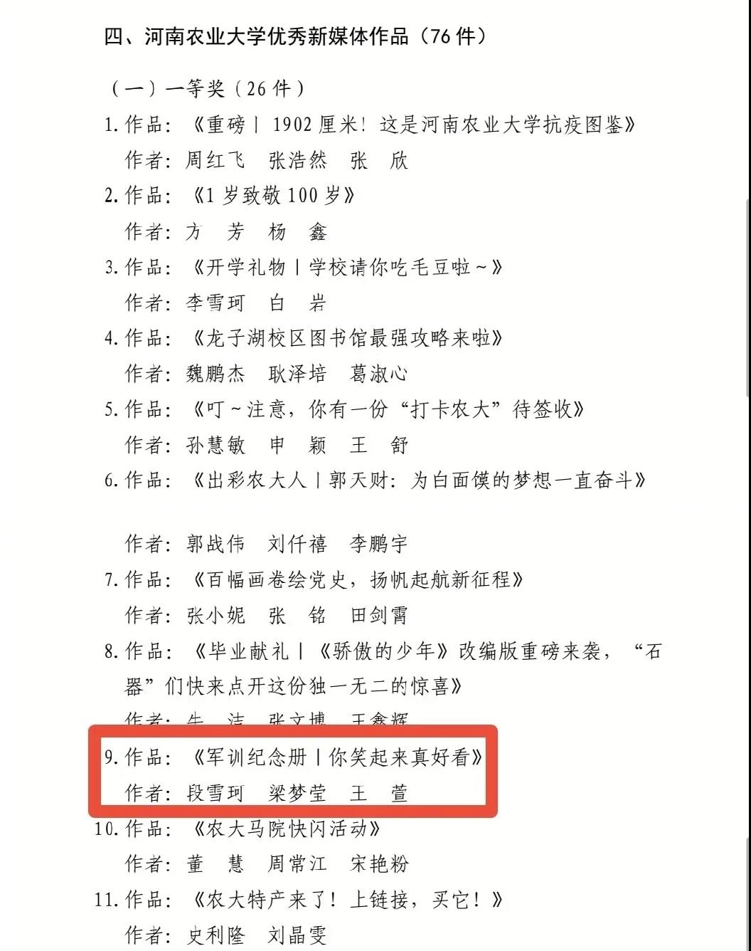 十佳新媒体平台、十佳短视频、优秀新媒体工作者、优秀新媒体作品的决定文件》(校党宣〔2021〕12 号)。院团委副书记陈翔、院新媒体主任梁梦莹荣获“优秀新媒体工作者”的荣誉称号,段雪珂等人作品《军训纪念册|你笑起来真好看》荣获一等奖,祁红丽等人作品《战“疫”必胜 | 哔咔漫画