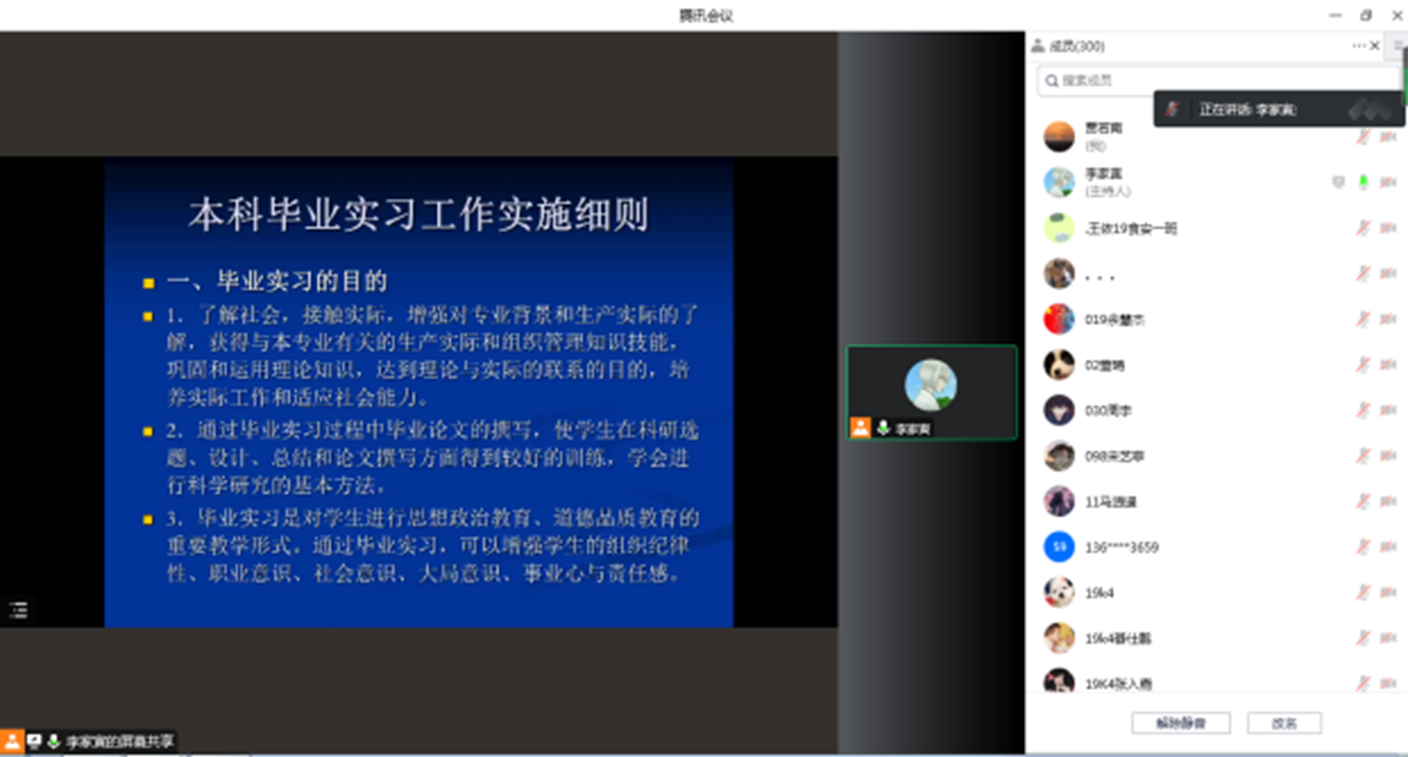 本科毕业论文(设计)工作实施细则》对2023届本科毕业实习和本科毕业论文答辩的具体要求进行讲解,并对毕业答辩程序、需上交材料等进行了严格要求。此外,李家寅向同学们讲解了学院对实习地点、实习时间、师生“双选”等的安排,并要求学生实习过程注意自身安全,有问题及时联系导师及学院解决。
