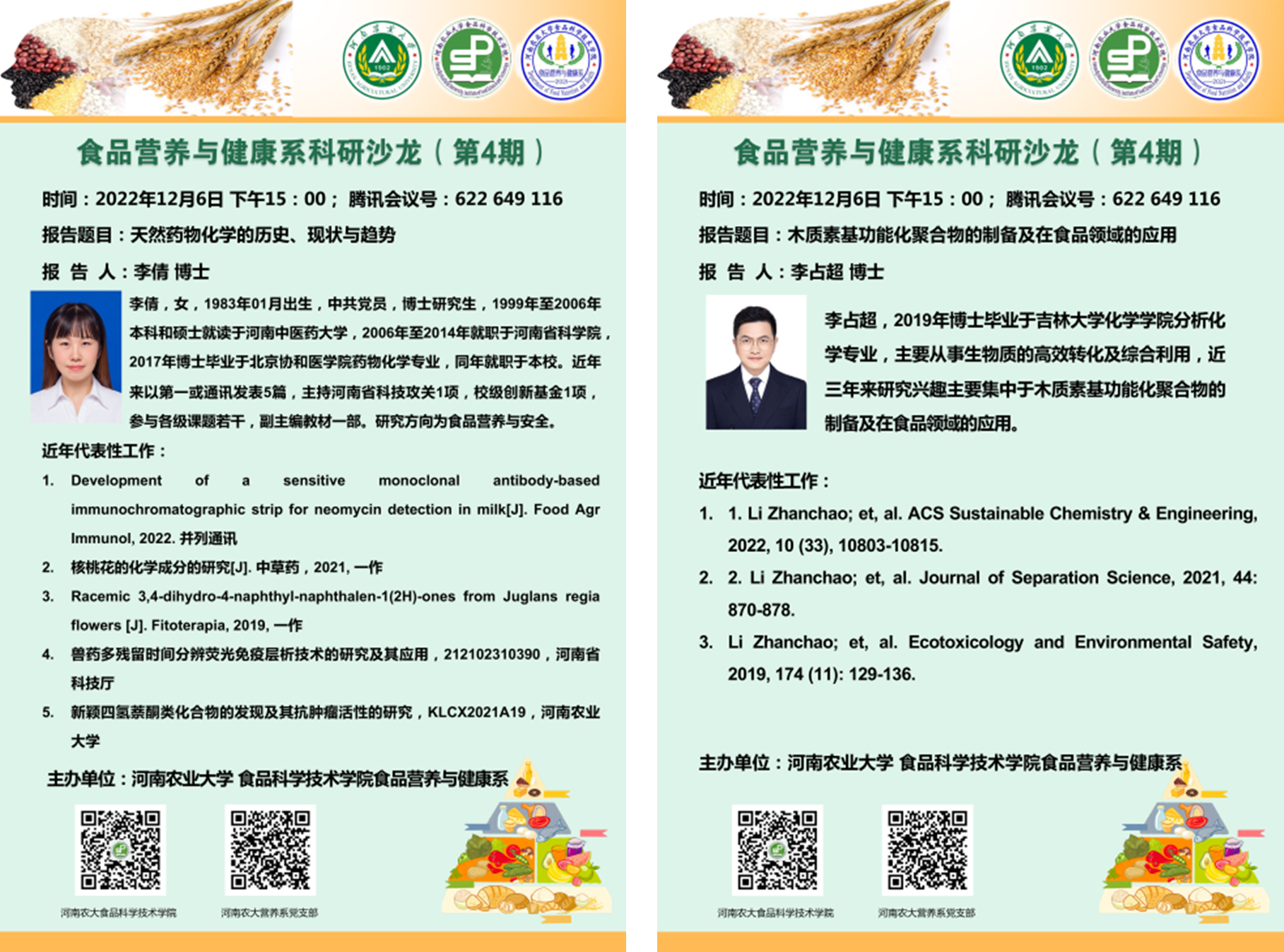 (通讯员:张波波,李天歌)2022年12月6日,食品营养与健康系于线上举办了第四期“科研沙龙”系列学术交流活动,由李倩博士和李占超博士进行主题报告,李宁教授主持了此次科研沙龙活动。