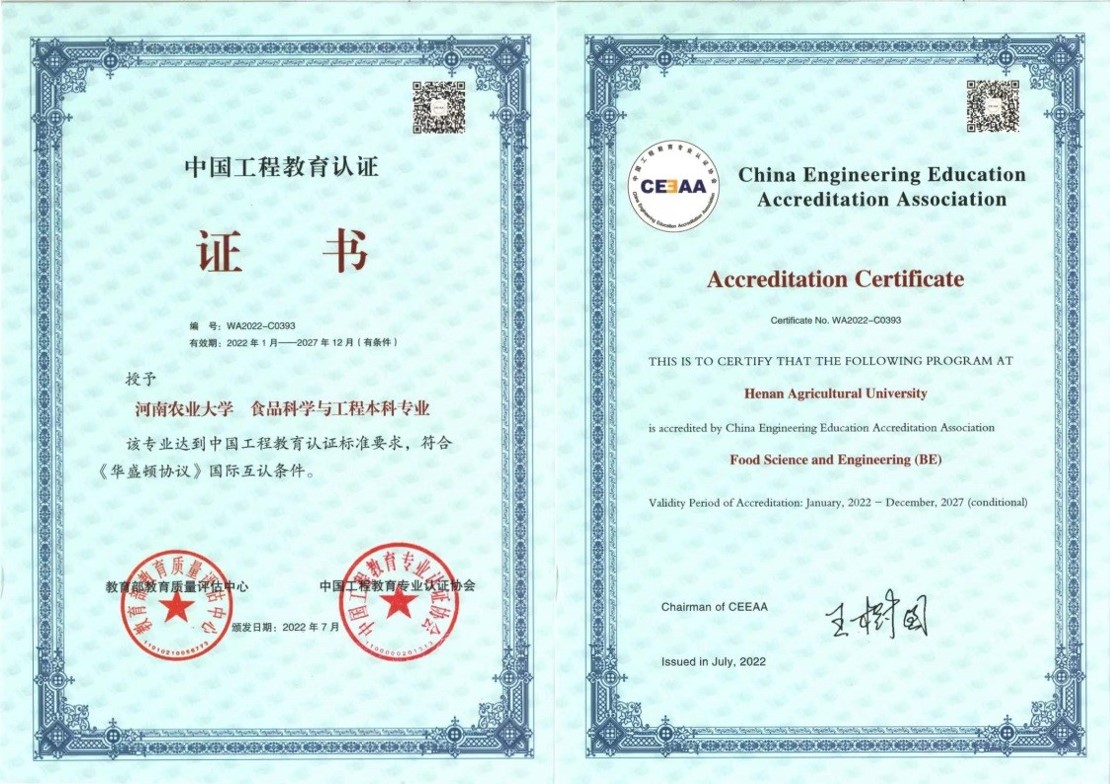 食品科学与工程专业从2016年开始按照工程教育认证的要求进行专业改革,经过多年的建设,成效显著,2021年11月通过工程教育认证专业组的进校考察,2022年7月正式通过了工程教育认证并获得了证书。