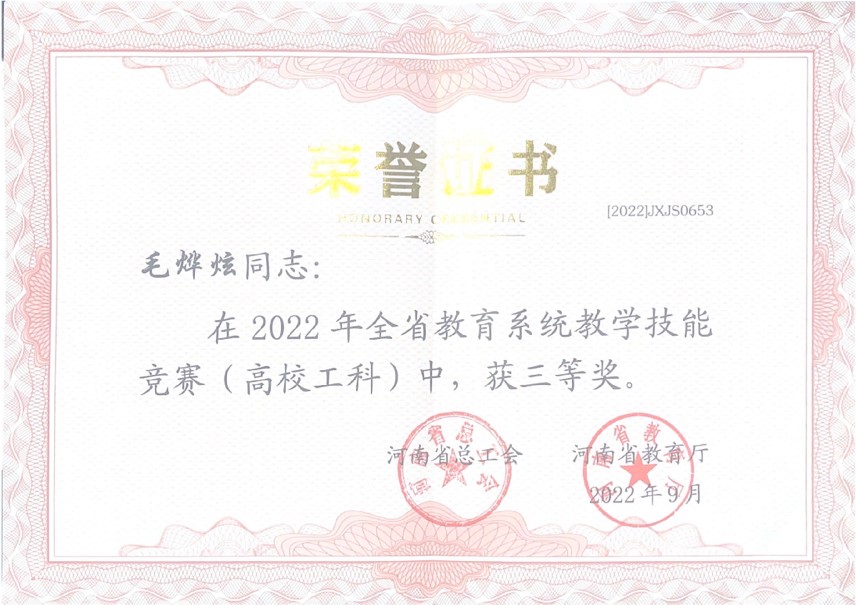2022年,学院全力支持开展课程建设,多项课程获批省级课程建设项目。其中《食品机械与设备》、《食品分析与检验》、《食品营养学》获批2022年河南省(线上)一流本科课程;《食品添加剂》被评为河南省(线上线下混合式)一流本科课程,同时被评为河南省课程思政示范课程。《食品毒理学》获批2022年度河南省继续教育精品在线开放课程。《食品工厂设计与环境保护》、《食品安全学》等4门课程被评为校级一流本科课程与校级课程思政示范课程。《食品化学课程组》、《功能性食品课程组》被评为校级优秀基层教学组织;雷萌萌获批哔咔漫画 教学名师。李宁获得校教授授课大赛一等奖,原晓喻、毛烨炫分别获得河南省教学技能大赛二等奖、三等奖。