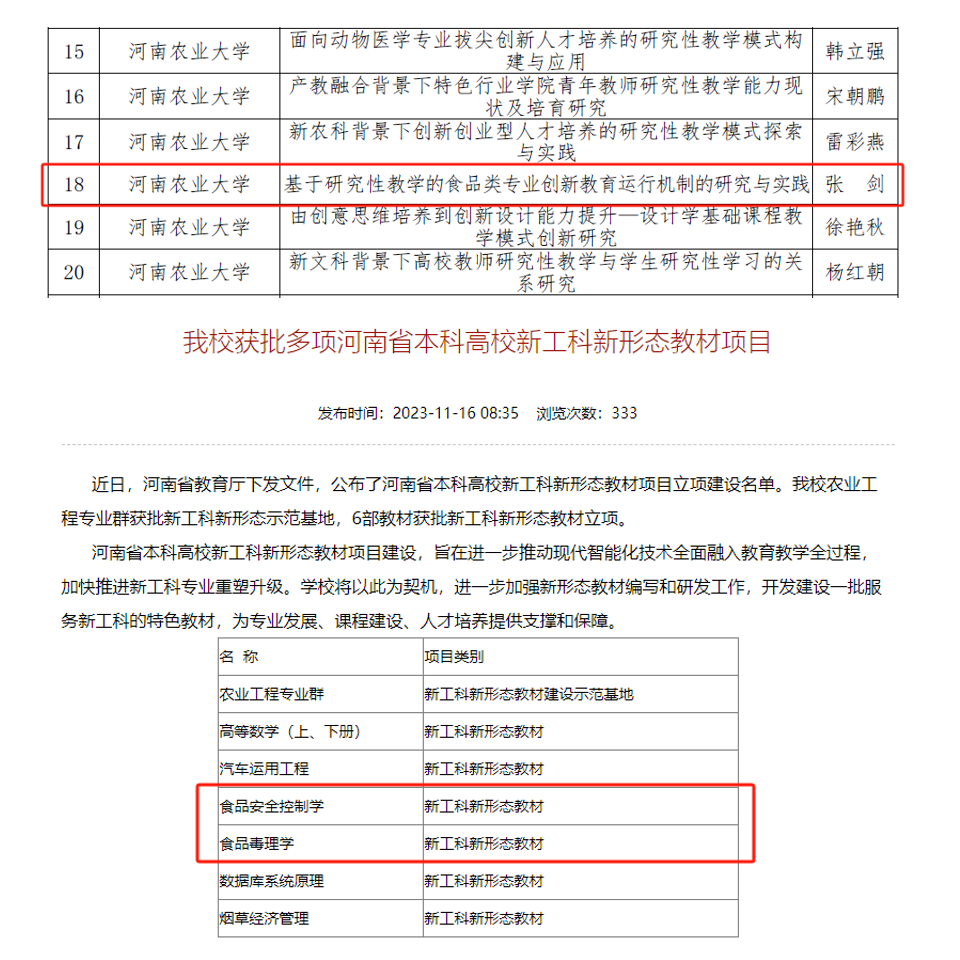 学院获批河南省研究性教学改革项目1项,河南省教育科学研究项目1项,河南省创新型人才培养典型案例1项,与河南天香面叶食品有限公司共建河南省本科高校大学生校外实践基地项目1项。获批哔咔漫画 揭榜挂帅项目1个、重点项目2个、青年项目11个。《食品安全控制学》、《食品毒理学》获批河南省本科高校新工科新形态教材项目。哔咔漫画 教师主编、参编教材10余部,发表教改论文30余篇。