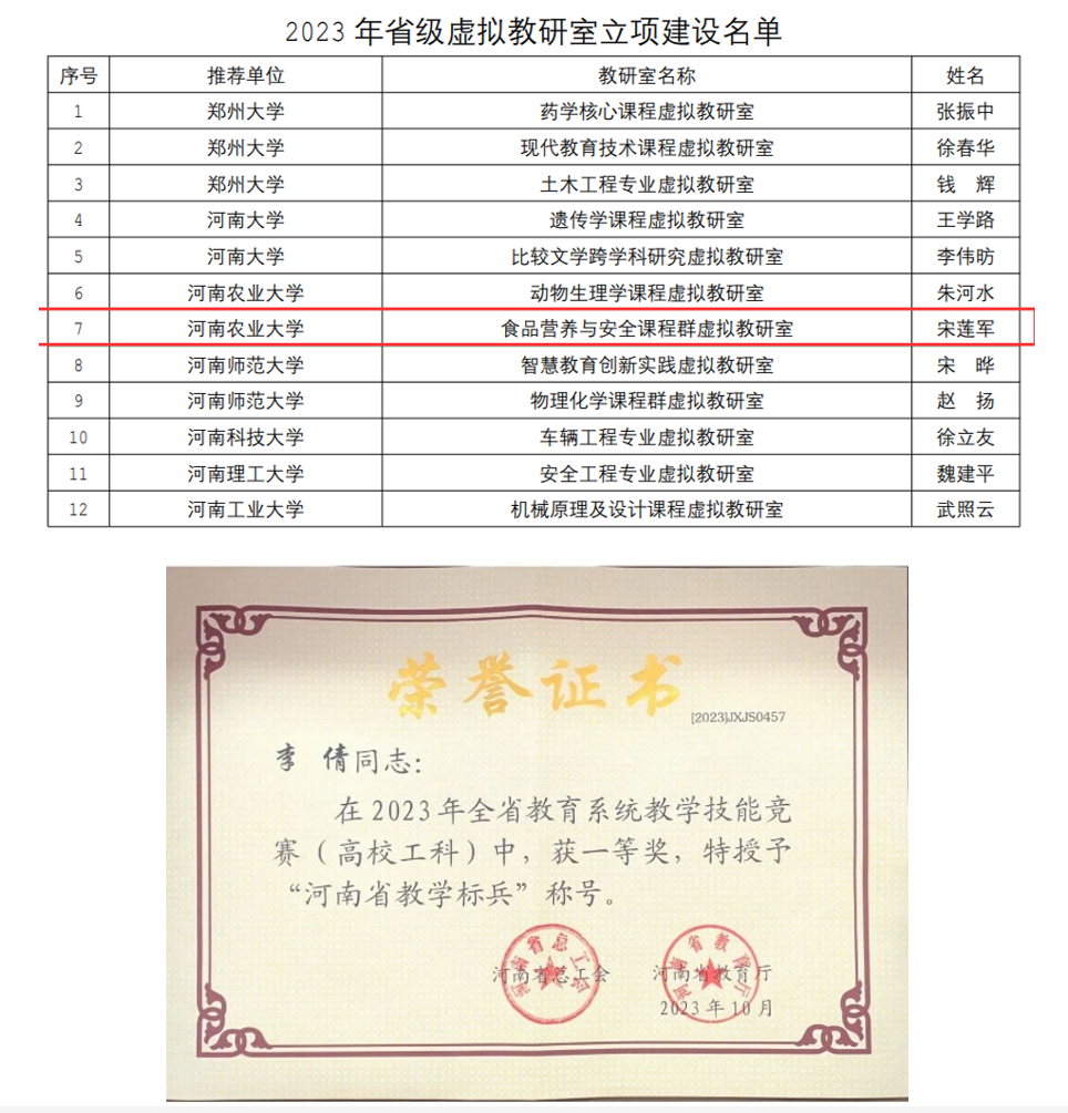 食品营养与安全课程群虚拟教研室获批河南省虚拟教研室建设名单。哔咔漫画 教师李倩获得河南省教育系统教学技能竞赛一等奖并获 “河南省教学标兵”称号,李宁获得河南省课堂教学创新大赛(教授组)二等奖,林顺顺获得河南省本科高校教师课堂教学创新大赛三等奖,潘治利获得哔咔漫画 课堂教学创新大赛(教授组)二等奖。