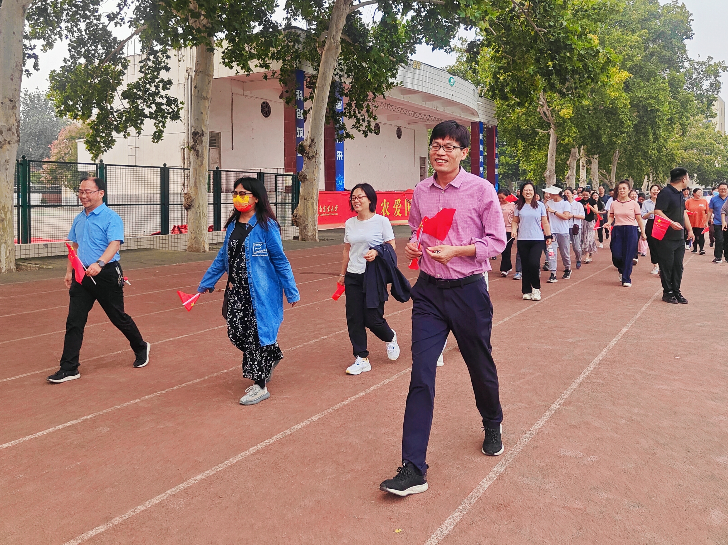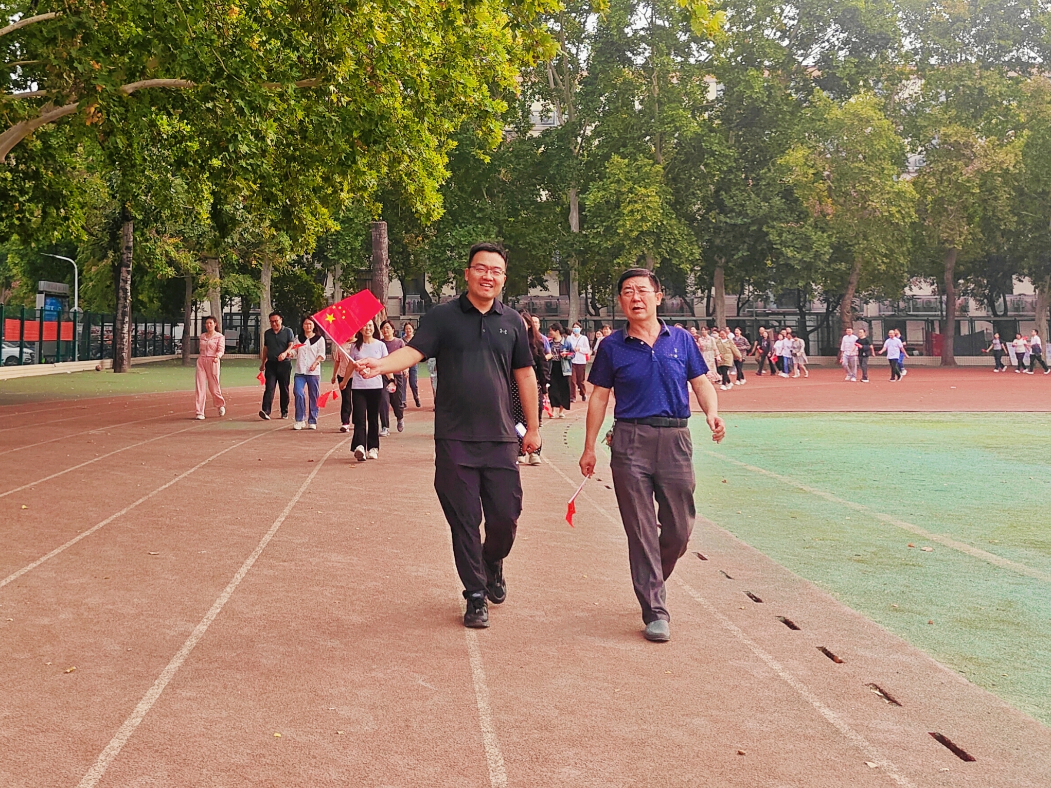 于近日在文化路校区操场举办了以“同心筑梦迎国庆,强国有我谱新篇”为主题的健步走活动。此次活动吸引了众多老师的参与,大家在凉爽的秋风里,共同迈出了一步,展现了积极向上的精神风貌。