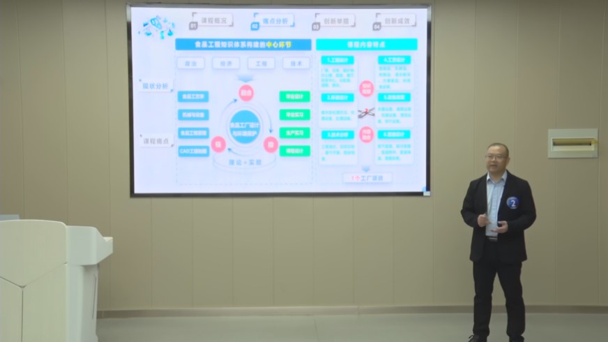 王小鹏副教授代表《食品工厂设计与环境保护》课程团队,作了题为“通过虚拟仿真实验链接融合 构建课程教学新体系”的创新成果汇报。课程团队提出的“依托虚拟仿真实验,项目制重构课程内容、多维度融合教学资源、沉浸式打造实验课堂”的创新理念,受到了复赛和决赛评委的一致肯定。
