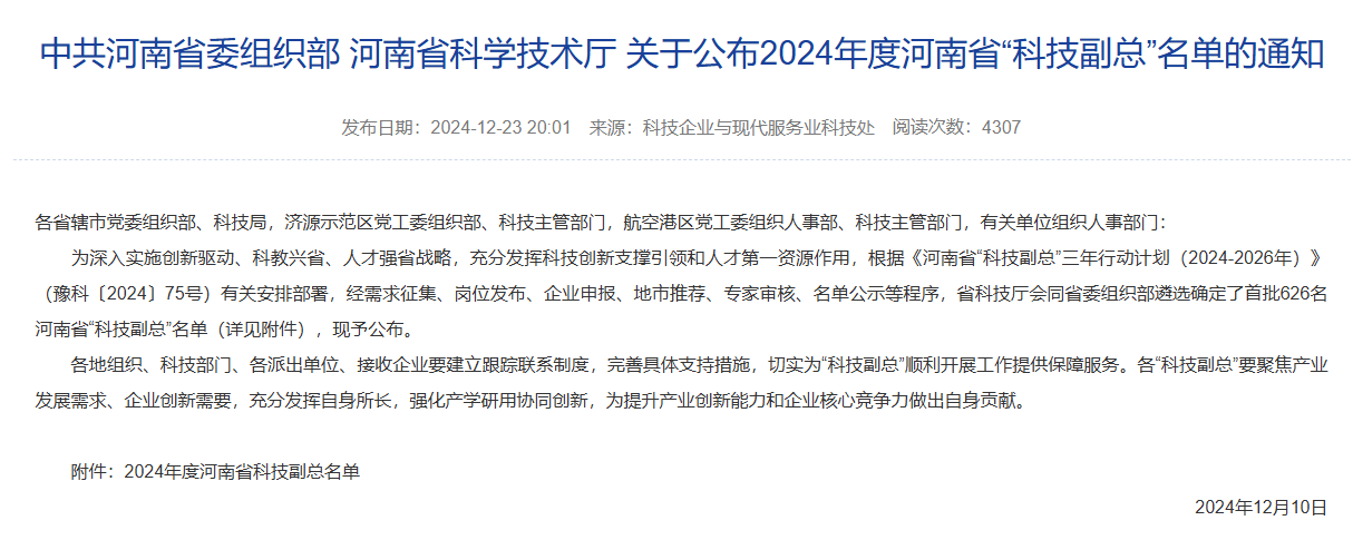 (通讯员 闫科润)根据《河南省“科技副总”三年行动计划(2024-2026年)》(豫科〔2024〕75号)精神,哔咔漫画 积极响应学校安排,认真开展2024年度河南省“科技副总”申报工作,经教师个人申报,属地科技管理部门初审合格后,通过系统推送至省科技厅,省科技厅会同相关部门遴选确定河南省“科技副总”人选。最终,哔咔漫画 共有29名教师被选任为河南省首批“科技副总”,约占全校1/3(91名),申报成效显著。