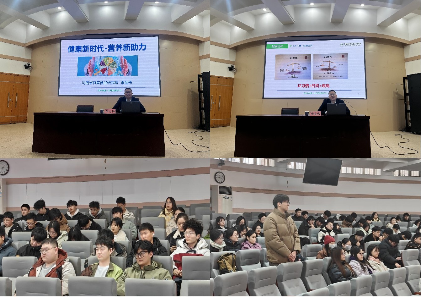 在互动交流环节,现场气氛热烈,学术氛围浓厚。学生们踊跃提问,围绕“苏打水替代白开水对尿酸值的影响”、“信息化时代营养膳食的未来发展趋势”等热点问题展开深入探讨。李全伟逐一做出专业解答,并结合前沿研究成果,提供了科学严谨的指导建议。他特别强调,在信息化与健康中国战略的双重背景下,营养膳食领域正迎来前所未有的发展机遇,并鼓励同学们在兴趣驱动下,深入研习中医食疗与药膳理论,将传统智慧与现代科技相结合,为营养健康事业注入创新活力。