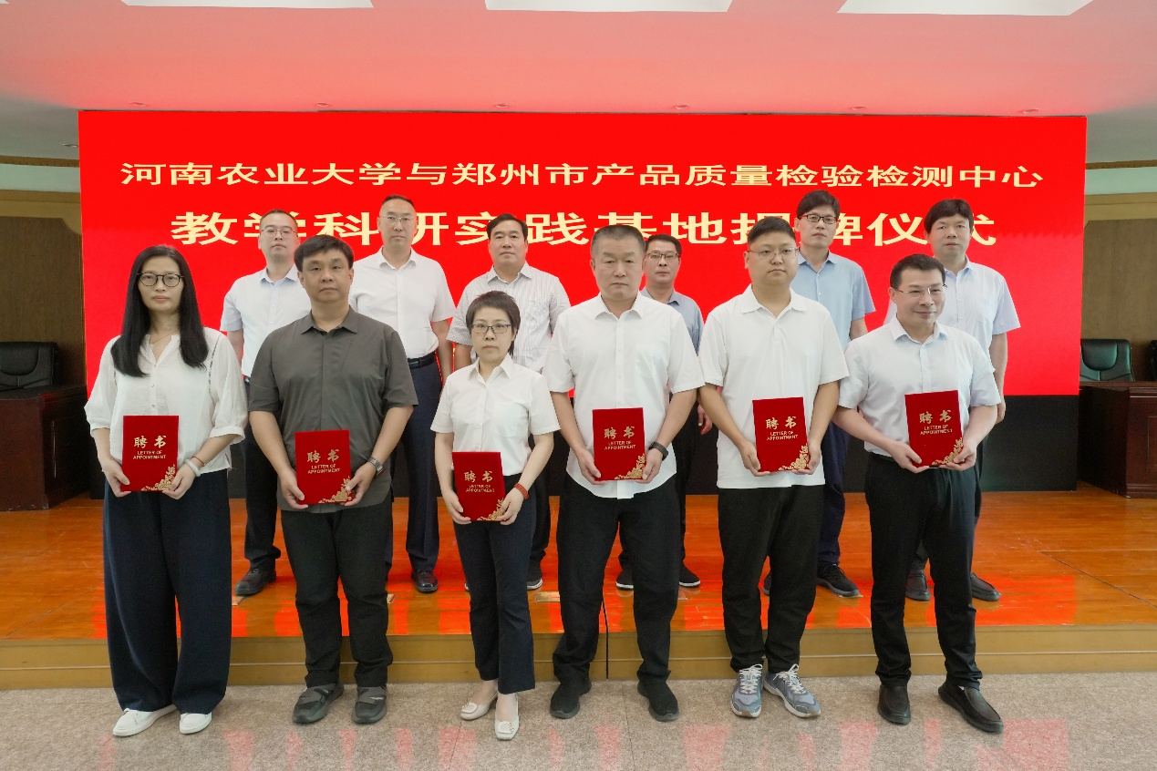 副院长张剑、郑州市产品质量检测检验中心党委书记段祥生、副主任赵树人等共同为检测中心遴选的校外指导教师代表颁发了聘书。随后双方代表合影留念。