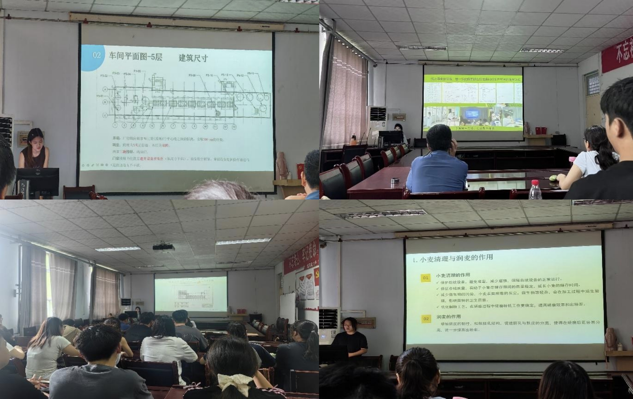 实习期间,教学院长张剑与李梦琴教授深入企业开展中期考核,着重指出生产实习在人才培养体系中的核心价值,围绕小麦清理工艺、制粉全流程及建筑绘制规范进行系统性指导。同时对金苑实习生的阶段性进展及展现出的勤勉务实、虚心向学风貌给予充分肯定,提出更高阶的成长目标与实践准则,要求同学们深耕物料流量调控、风网系统排布等关键技术环节,深度剖析制粉生产实际问题,推动理论知识在实践中真正内化落地。