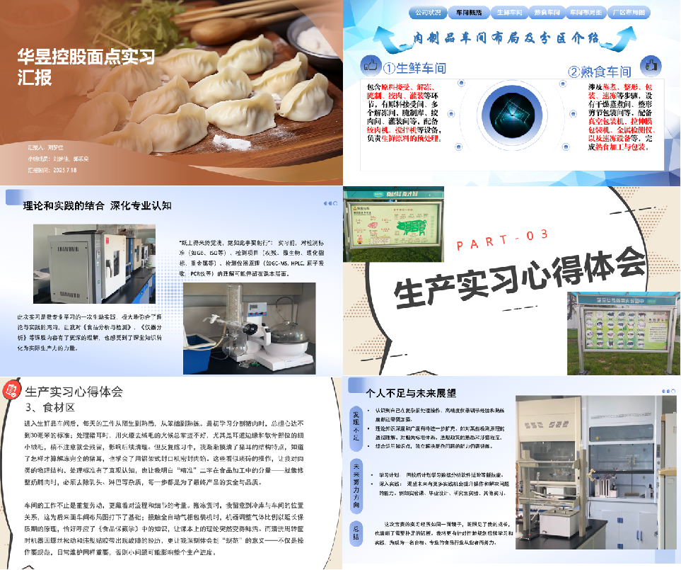 河南华昱控股有限公司作为全国知名的肉食品企业,为本次实习提供了优质的实践平台与坚实保障。公司领导高度重视,相关部门精心组织,制定了针对性强的实习计划并配备经验丰富的带教老师。实践中,学生被分为生鲜事业部、肉制品事业部、东方伊厨面店事业部及鲜咨达检测中心四个小组,深入对应生产线和实验室。学生们还参与了产品质量检测和数据分析工作,深刻理解了食品安全和质量控制的重要性。通过亲身实践,同学们得以将课堂所学理论知识与复杂的实际生产环境进行有效对接,不仅亲身感受了现代食品工业的规模、效率与科技含量,更深刻理解了“安全、营养、高效”的食品工业核心理念。