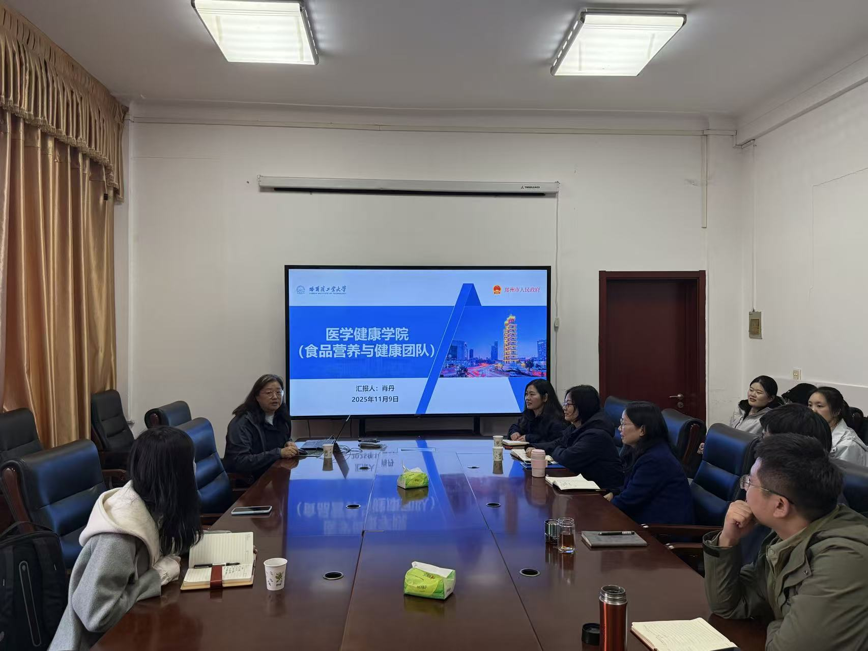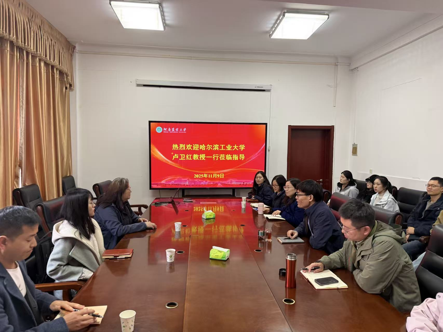 黄现青对哈工大专家的到访表示热烈欢迎,他详细介绍了学院在师资队伍建设、科研平台布局、人才培养模式及校企合作等方面的成果,重点阐述了学院的食品特色研究方向与关键领域的技术优势。他强调,未来将进一步深化与哈工大医学与健康学院及郑州研究院的务实合作,通过联合申报科研项目、共建研发平台等方式,助力食品学科创新发展。