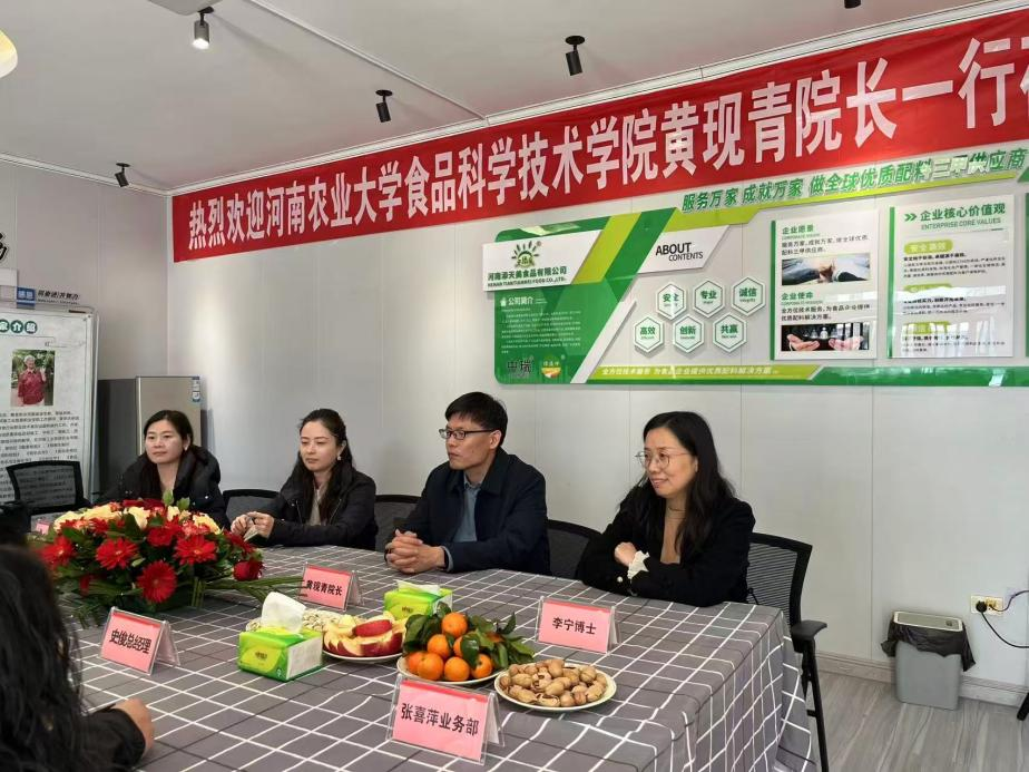 院长黄现青教授带领李宁教授、海丹副教授、白歌博士一行,专程赴河南添天美食品有限公司开展访企拓岗交流活动,双方围绕技术攻关、合作共建、人才培养等议题展开深入探讨。