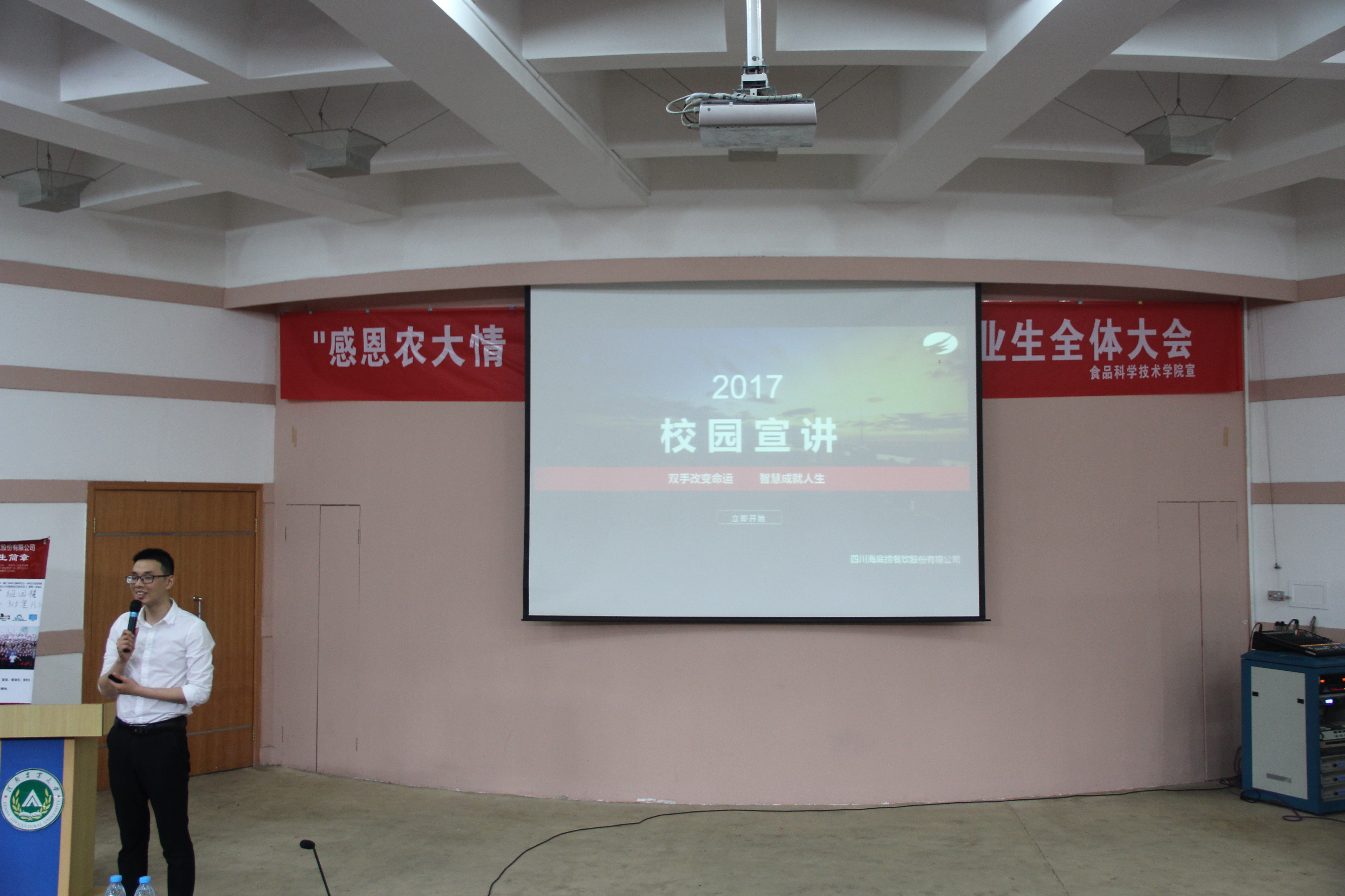 在文化路校区三百人报告厅举办海底捞公司校园宣讲会,四川海底捞餐饮股份有限公司负责人杨孟杰担任主讲,学院全体毕业生参加大会。
