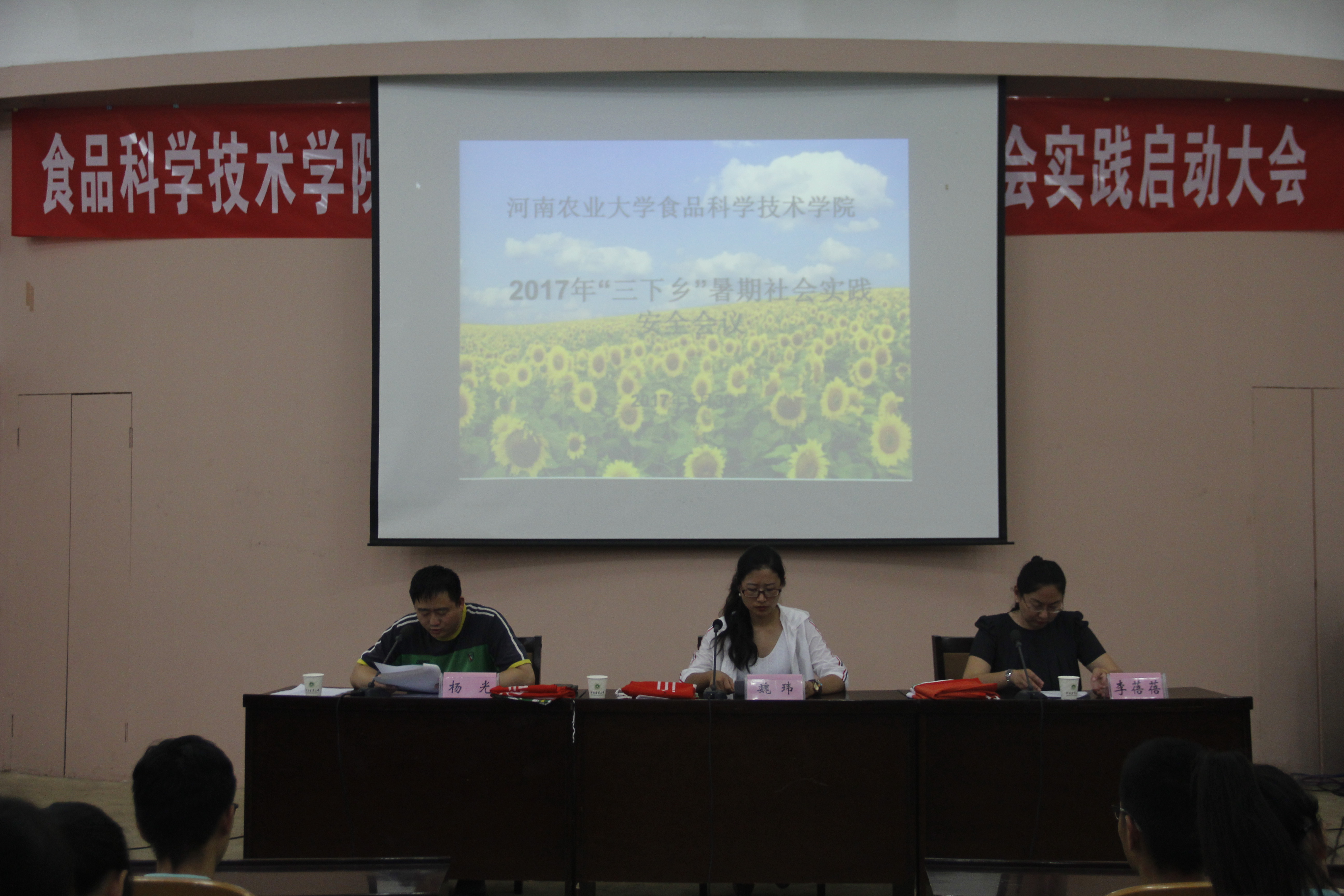 在文化路校区三百人报告厅召开2017年“三下乡”暑期社会实践安全会议,院党委副书记魏玮,院团委书记李蓓蓓,院团委副书记杨光出席会议,学院全体社会实践成员参加会议。