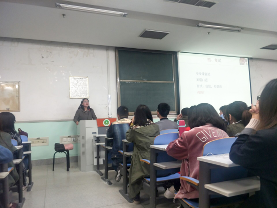 在报告会上,李苗云从个人选择方向出发,在就业方面以个人能力和第一职场工作为例,指出同学们在就业期间应时刻提高自己的能力,珍惜时间。在考研方面就考研的意义与优势、学校及专业选择、心态调整、备考、复试及调剂等几个方面的问题做了重点指导。她指出,考研的院校应根据自身特点选择最适合自己的,要确定自己能考什么,要考什么,同时提醒大家应从各大院校的研究方向及招生人数来决定自己的报考方向,此外,李苗云强调,积极的心态、坚定如磐的信念,是学生准备考研的基石,也是至关重要的环节。最后,她建议同学们要学会适时利用运动、旅游等方式调整自己,以保持良好的学习状态。