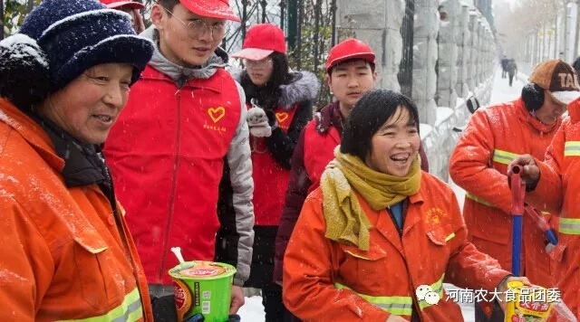 银装素裹,寒风依旧,却无法阻挡学生送温暖的身影。身着红色马甲的志愿者们自费购买了方便面、牛奶、鸡蛋和面包,提着几壶热水就向依旧在工作岗位辛苦工作的环卫工人们赶去,为他们送去温暖。志愿者们端热水泡泡面,与工人聊天,帮助他们清扫路面积雪,现场其乐融融,一股股暖流在大家心间流动。大家与环卫工人交谈得知,他们从早上凌晨四点就开始清扫街道,遇到恶劣天气就会很辛苦,几乎没有休息时间,比如现在路上积雪严重,落叶多,工作时长达到16个小时,今天很感谢同学们送来热面条,很暖和,很舒服,也很开心。同时也希望同学们能够好好学习。”正是有了环卫工人在寒冬一丝不苟的工作坚守,才会有我们的安全出行。正如志愿者李达所说“大雪天,最累的就是环卫工人,我们尽一点微薄之力,希望更多的人来关心他们。”