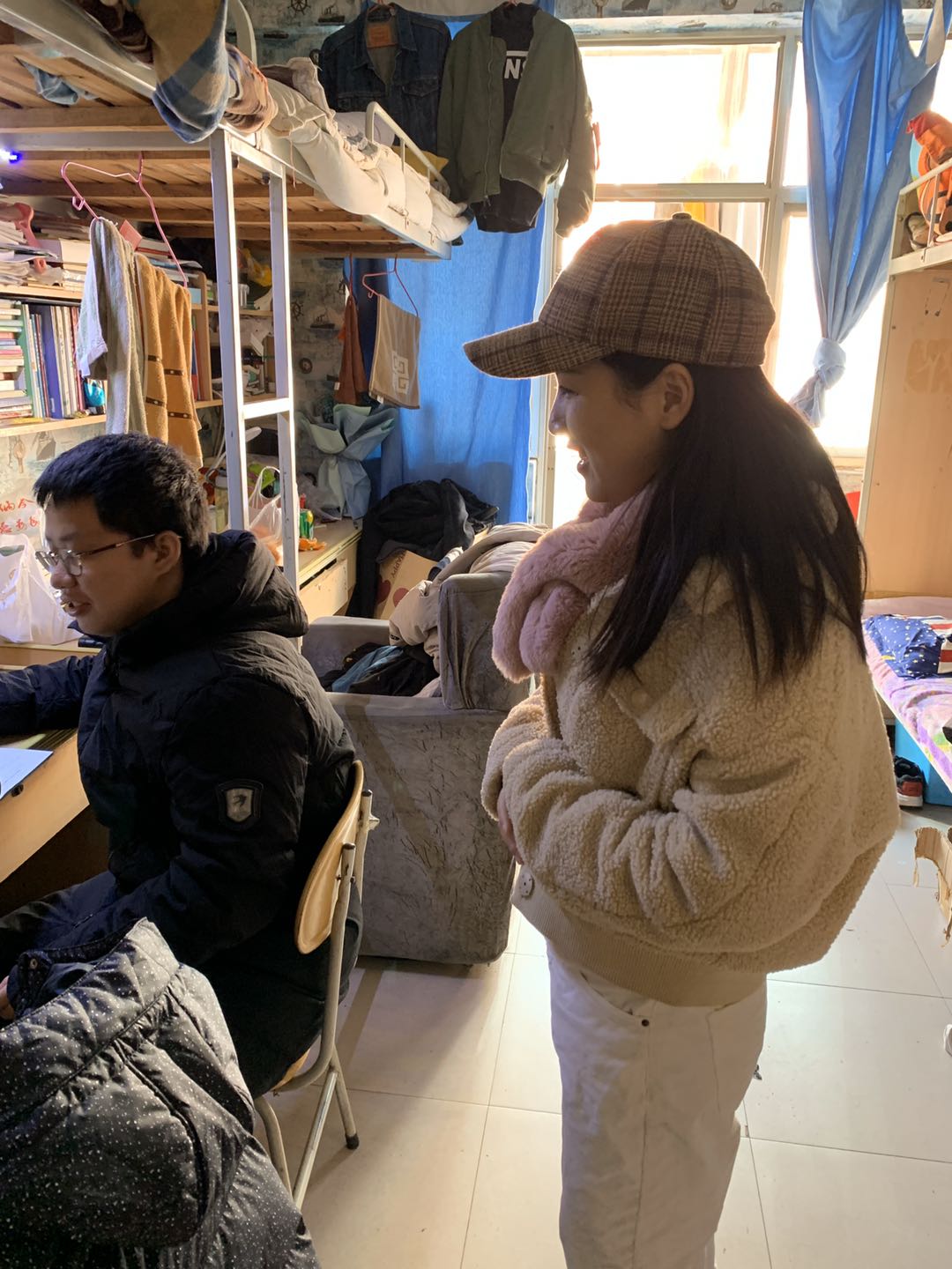 辅导员王凡、黄姗姗走访大四学生宿舍,看望即将考研的同学,了解学生生活状况及思想动态。