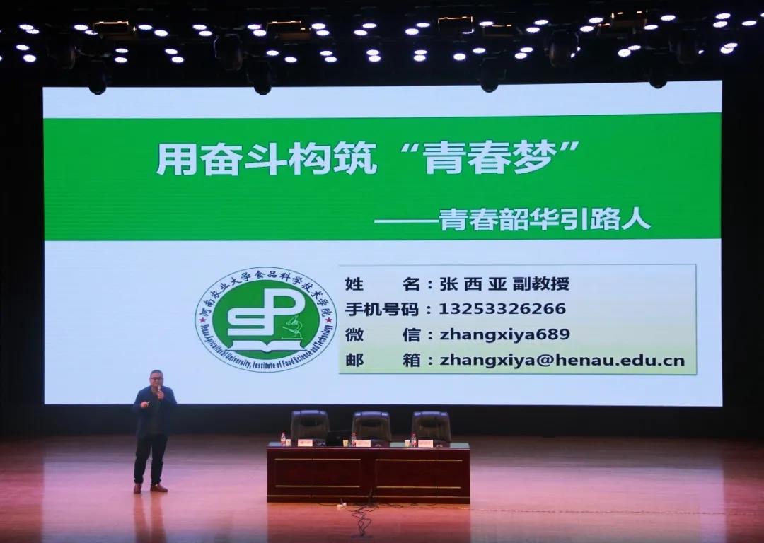 为河南省食品行业做出了突出贡献。接着,梁栋分享了自己求学经历及个人感悟,结合自身经历阐述了“知识改变命运”的重要性,并根据自己的学术知识介绍了对食品专业的理解与认识,帮助同学们更深刻地了解食品专业。随后,张西亚通过示意图的形式讲述了自己的求学历程,并分析了食品行业的现状和食品专业的就业方向,强调同学们要培养多方面的能力。最后,张西亚与同学们互动交流,现场为同学们答疑解惑,帮助同学们树立目标,更好地规划大学生活。