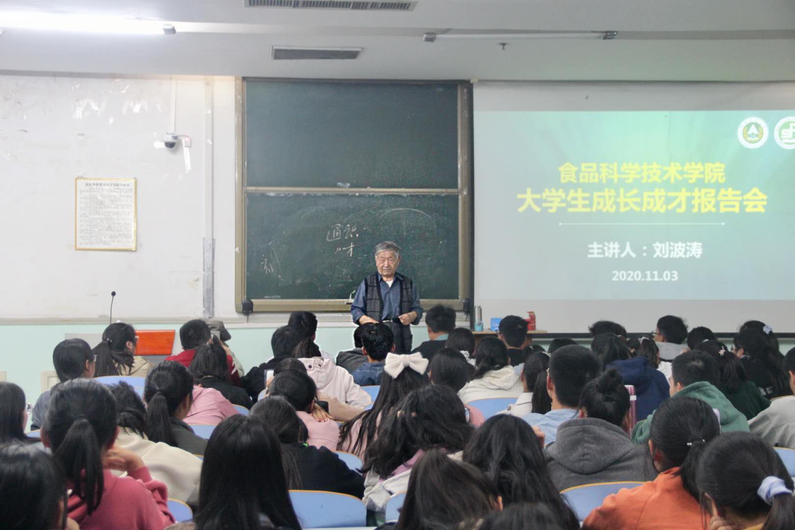 特邀校教学督导、院关工委阳光督导刘波涛教授在文化路校区工程楼302教室做大学生成才成长报告会,2020级新生参加会议。