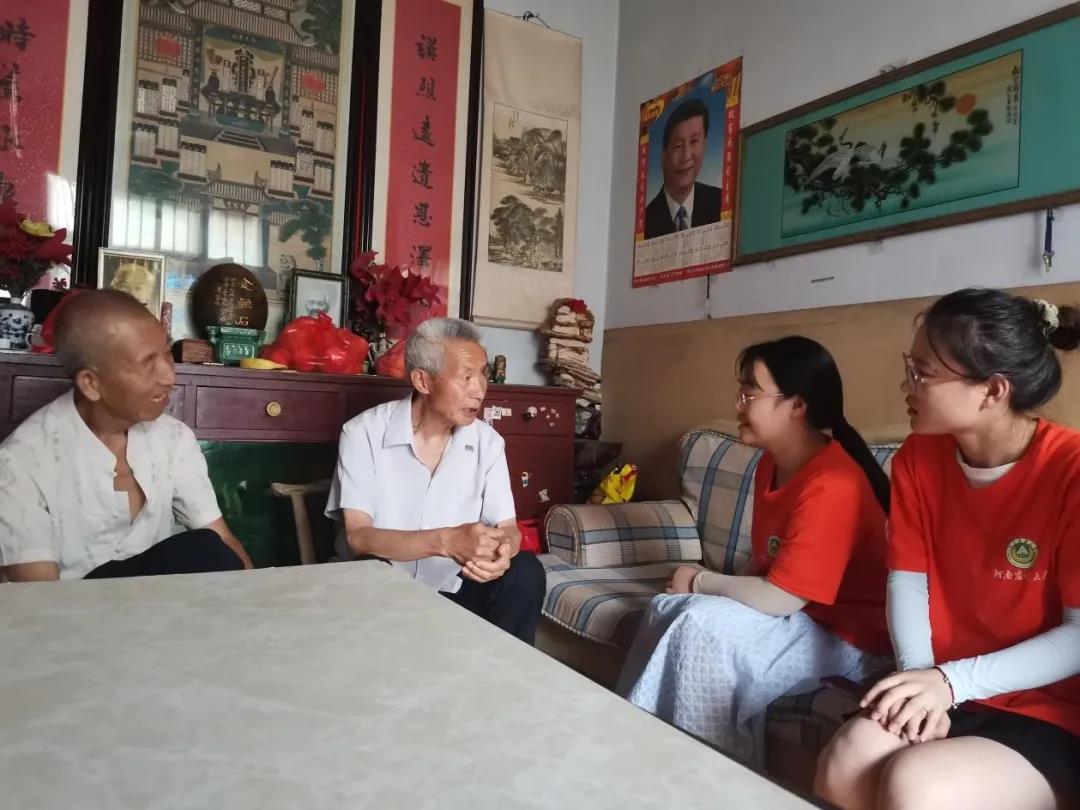 7月7日上午,实践团寻访了农大前身河南农学院老校友张石章老先生。交谈中,我们了解到老先生在离开大学后选择留在潭头任教,偏好学习的他博学多才,自学俄语、中医,对待学习的态度与精神令人敬佩,队员们纷纷表示要向老先生学习。接着我们寻访了任景岳老先生,倾听老先生讲述为河大培育牡丹七十余年的感人故事。最后,老先生将其书法作品赠与学院,借此表达对母校的感恩之情。
