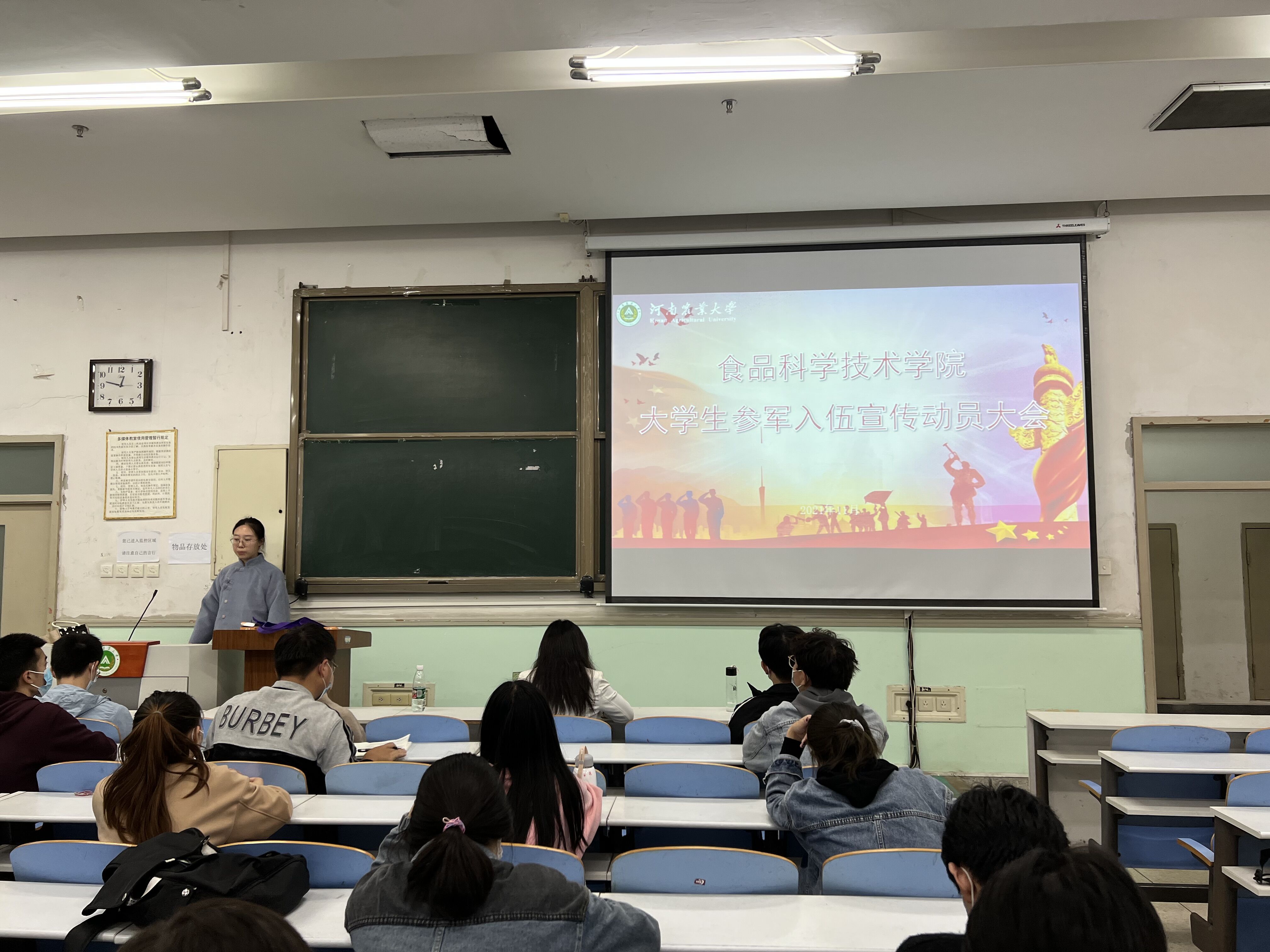 于文化路校区工程楼103召开以“参军尽义务,戍边卫国防”为主题的大学生参军入伍宣传动员大会,院团委书记路平、院辅导员张金龙出席会议,各班班长参加会议。