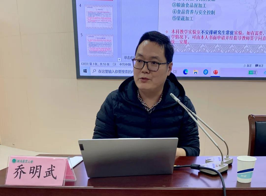 乔明武讲述了实验室的基本情况和实验室仪器设备的管理及使用细则。他以各种实验安全事故为例向大家讲述了树立安全意识的重要性,又从用水、用电、化学试剂等方面强调了一些实验注意事项。他希望大家能够从中进行反思,树立实验安全意识,避免实验安全事故的发生。