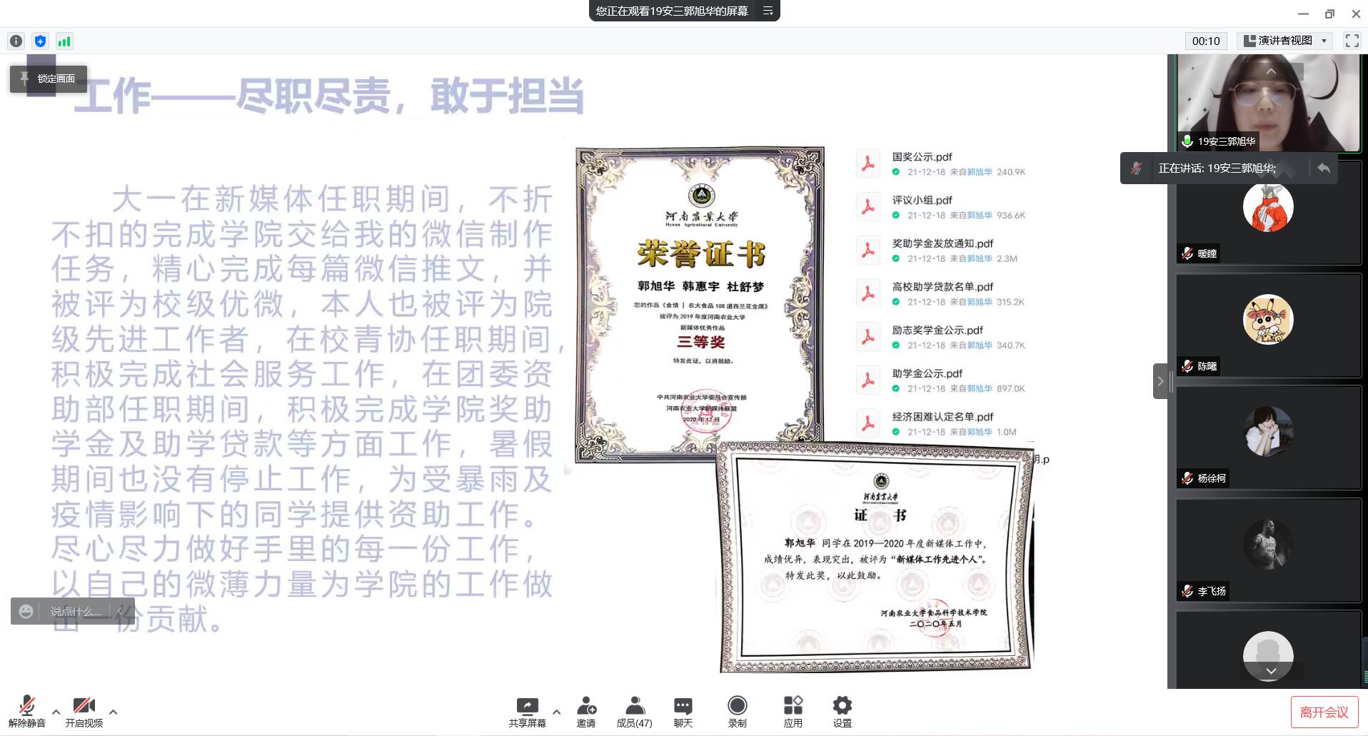 各位参选的个人与班级代表在有限的时间内,根据提前准备好的PPT对自身优势进行阐述。先进个人参选者们分别从学习、工作、荣誉、思想、社会实践等方面向大家分享了自己的经历。优异的成绩、卓著的荣誉、丰富的工作经验、向党靠拢的决心,无不表现出了他们独特的风采。班级代表们用班级的各项成就,以及班级同学们各项荣誉,为大家展现出了一个个井然有序,团结向上的集体。参选者与班级代表们面对演讲从容不迫、有条不紊,散发着自己的光芒,两个小时的会议,充分展现出了哔咔漫画