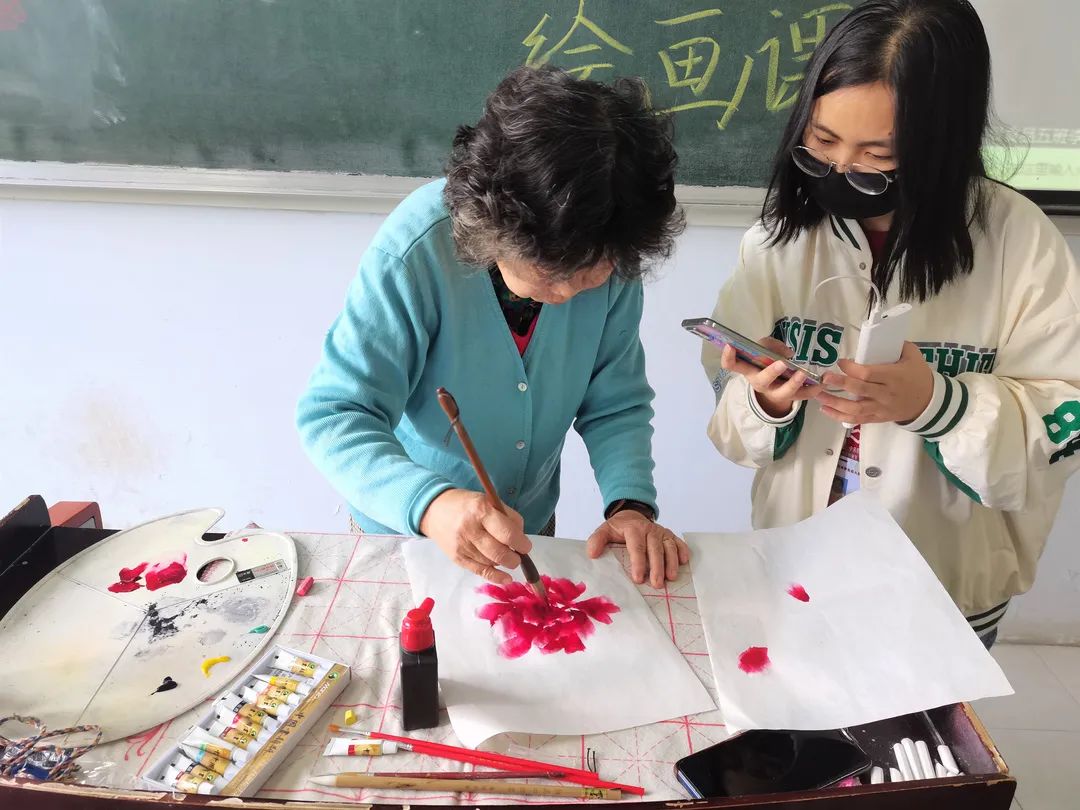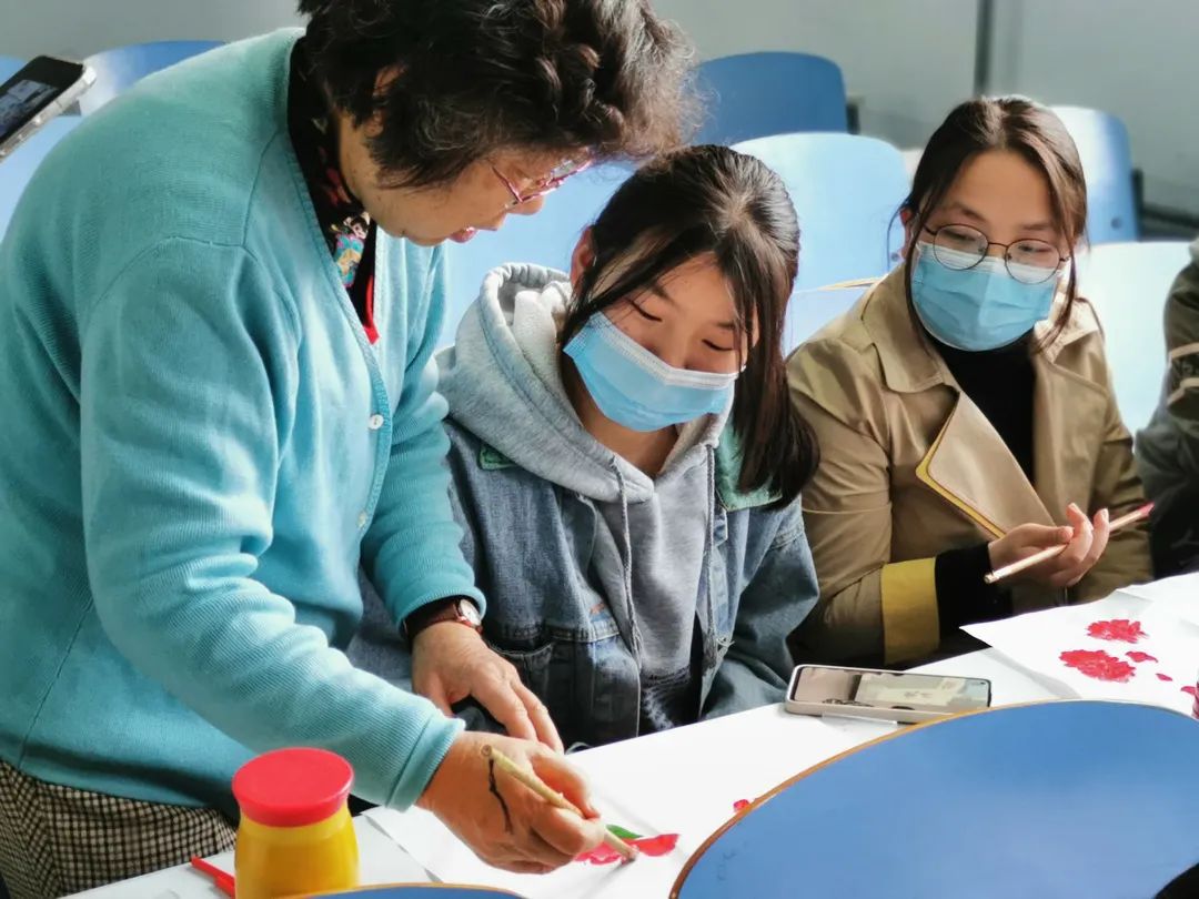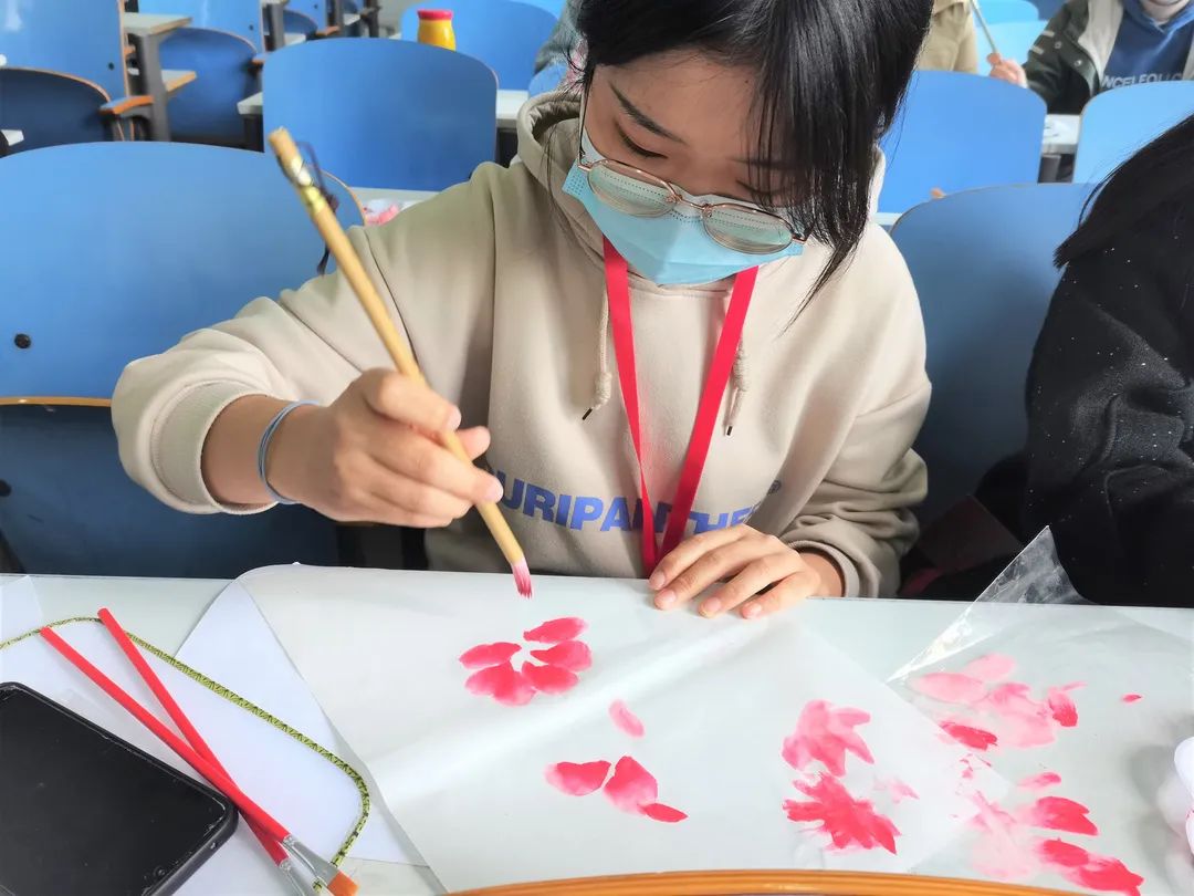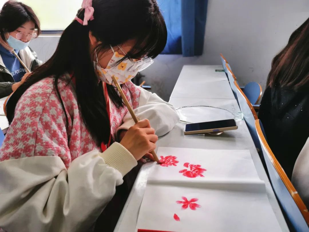 画的美感均凝聚在一点一滴的细节中。“握笔要准确,绘画要用笔的中间段,画笔要立起来一点,以保证花瓣的饱满度。”姚黎老师耐心地向同学们讲解了国画的特点和绘画技巧,并亲自示范。同学们全神贯注,火热青春和传统在此刻碰撞,融为一体。