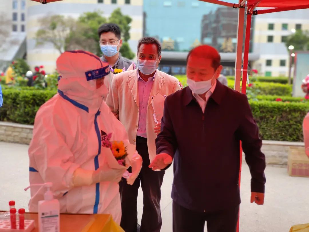 恰逢国际护士节,学校准备了鲜花献给现场辛勤付出的医护人员,并表达了对他们的祝福和感激。