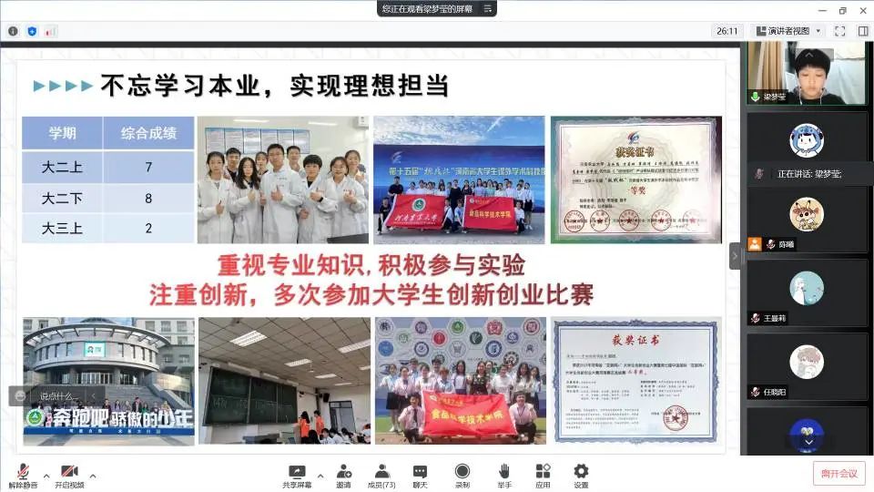 参选的个人与班级代表分别通过PPT展示的方式向大家进行介绍,评选过程实事求是、公开公正。各参选班级代表阐述了本班所获荣誉与班级风采,展现了昂扬向上、奋发进取、团结拼搏的班级形象。各参选个人在有效时间内,分别从自身工作经历、学习成绩、所获荣誉等方面进行了详细阐述,体现了参选人员勇于创新、追求卓越的优秀品质。