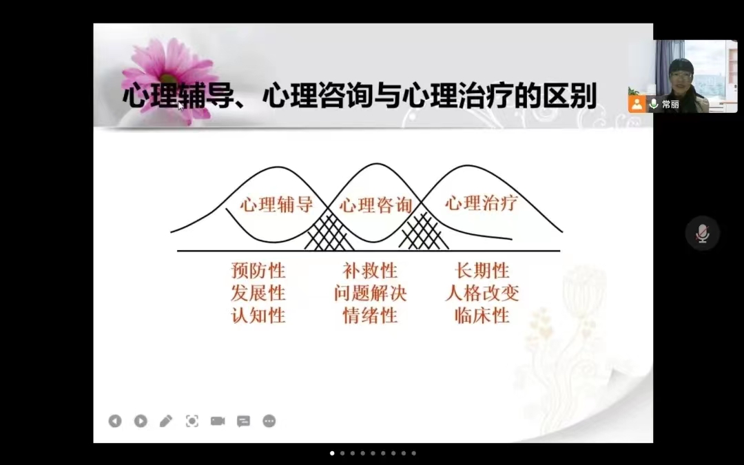 常丽表示,心理委员在心理健康教育中有极其重要的作用和独特的优势,各位心理委员要履行好自己的工作职责,敏锐观察、记录本班同学的心理动态,在自身能力范围内向同学们提供心理援助,及时向心理辅导站进行汇报,并对求助者的个人隐私做好保密工作。她强调,心理委员要鼓励同学们将心理咨询师和心理委员当作一个知心朋友,当出现心理上的问题时,及时进行求助、积极进行解决。