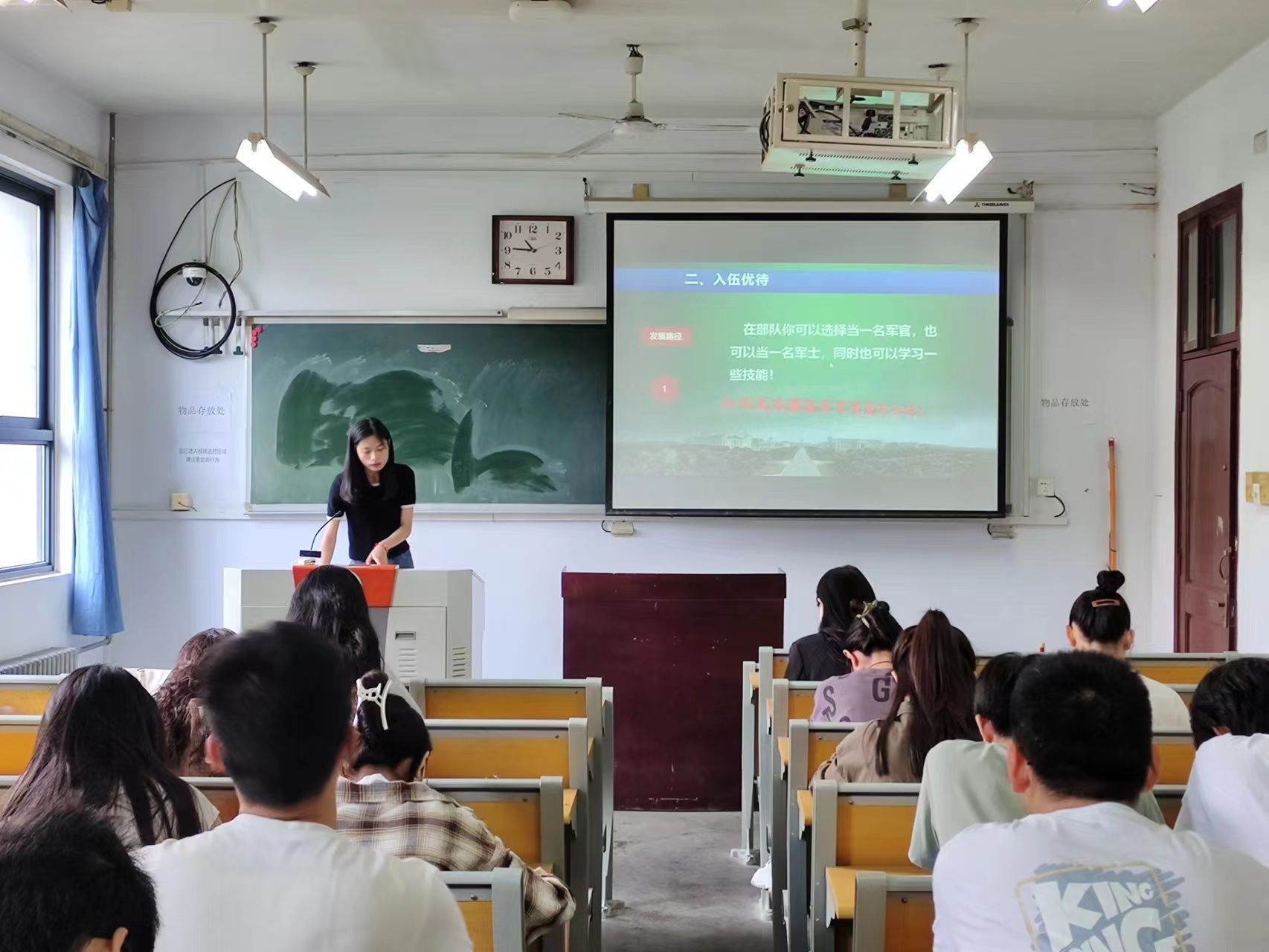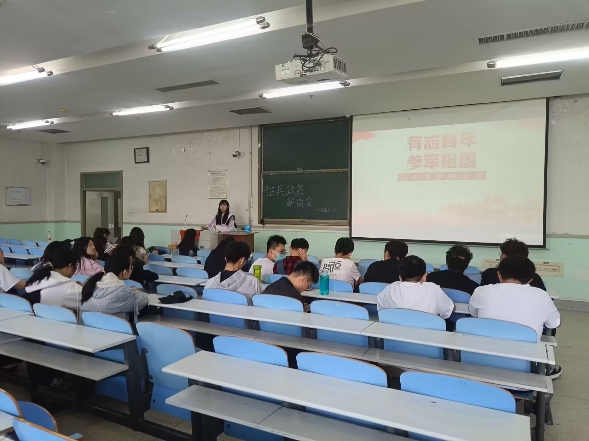 班会上组织委员动员班级同学,指出青年是国家未来的希望,征集优秀青年入伍,既是向部队输送新鲜血液,推进军队现代化建设的需要,也是提高青年综合素质的重要途径。各班组织委员对于征兵入伍的报名条件、时间、方式、要求以及所享有的优待政策进行了详细介绍。他们鼓励同学们积极参与到征兵的队伍中来。