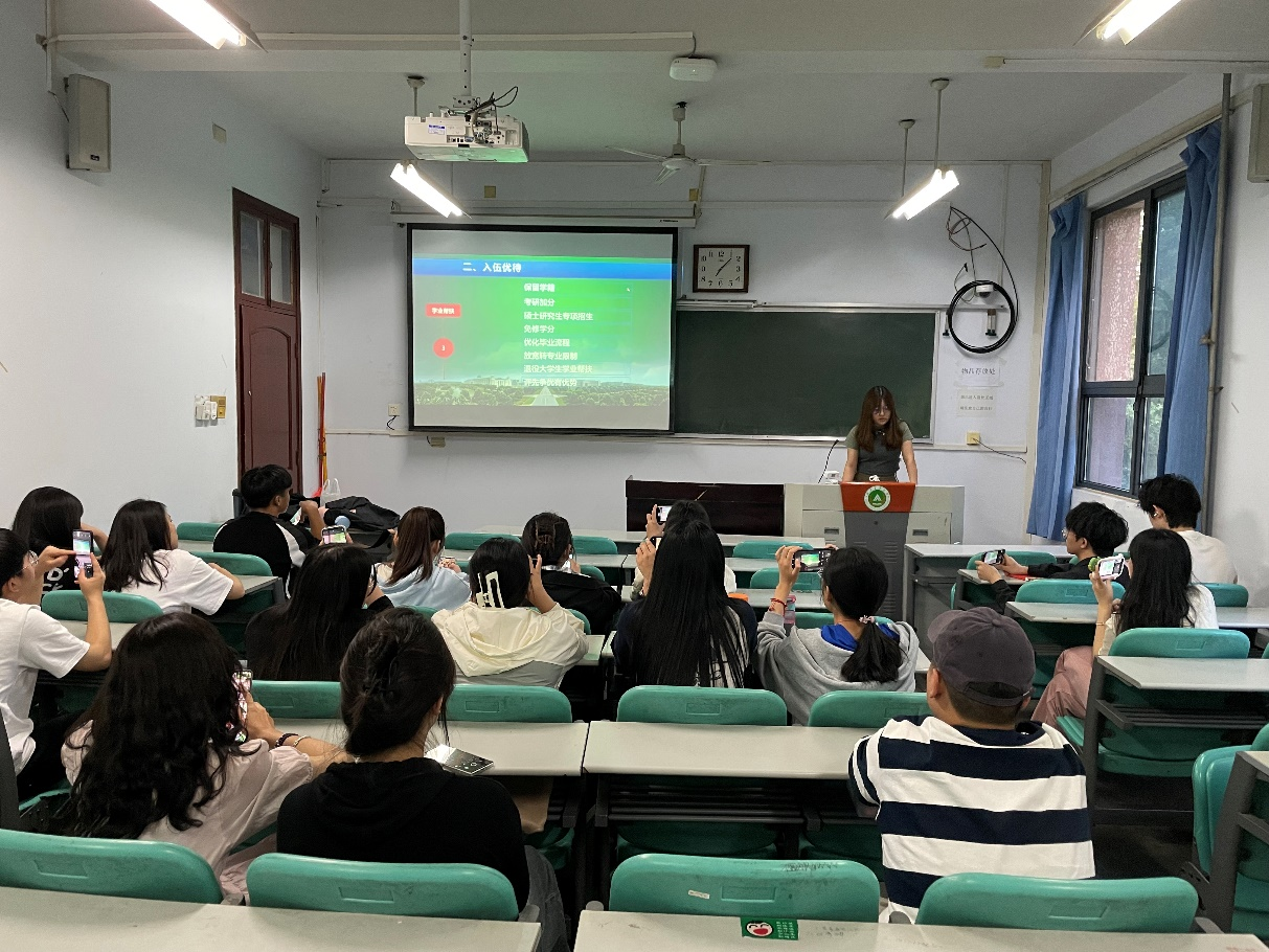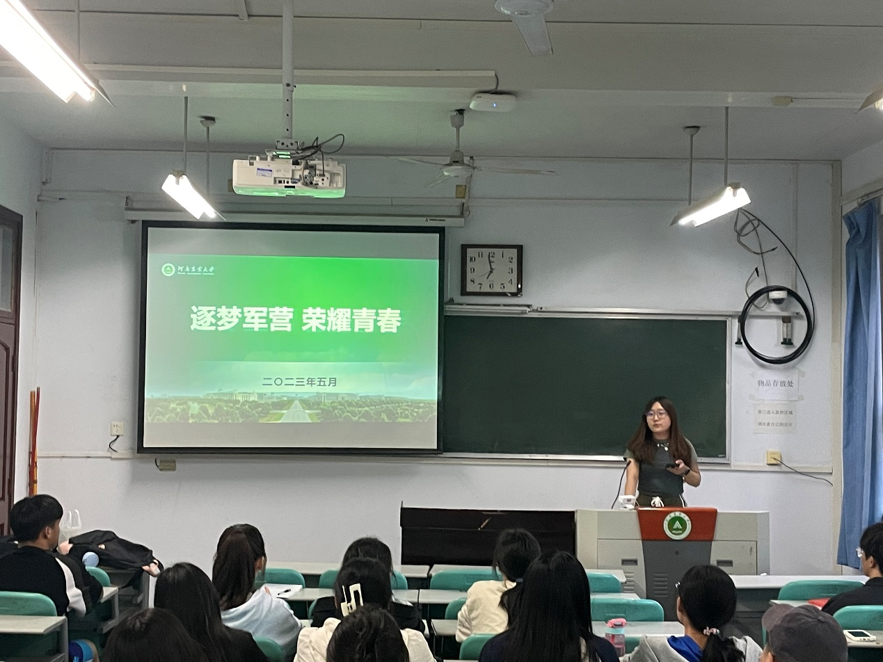 付严昆从征兵的重大意义、征兵流程、激励政策等方面向同学们进行介绍,详细讲解了报名时间及流程,并对视力、体重、身高和年龄等要求逐一说明。她强调,应征入伍政策良多,国家不断提高退役升学优待力度,为同学们的学业、生活、荣誉等方面提供了保障。大学生入伍是党中央、国务院、中央军委做出的重大战略决策,是新形势下加快军队国防现代化建设,实现强国梦、强军梦,维护国家总体安全的重要举措。希望同学们积极响应号召、踊跃参军,担负起中华民族伟大复兴的历史使命,做新时代中国特色社会主义事业的坚定接班人。