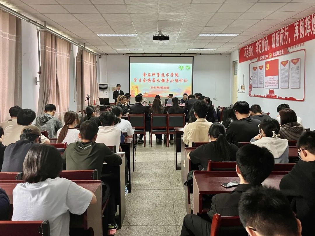 于文化路校区17号楼405召开学生会换届无领导小组讨论。院团委书记路平、院党委组织员陈翔、院团委副书记张金龙、19级食工一班廖浩宇以及学院各班学生代表出席会议,学生会12位主要干部参加竞选。