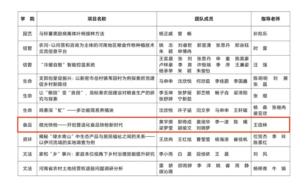 参赛作品《微光快检——开创普适化食品快检新时代》荣获二等奖;《保鲜“膜”法师——工业木质素高值化利用践行者》、《一检健康——“粮”心好面把关者》、《一种牛奶中磺胺类抗生素快速检测试纸条》、《传感检测——开发饲料真菌霉素防控体系》四项作品荣获三等奖。