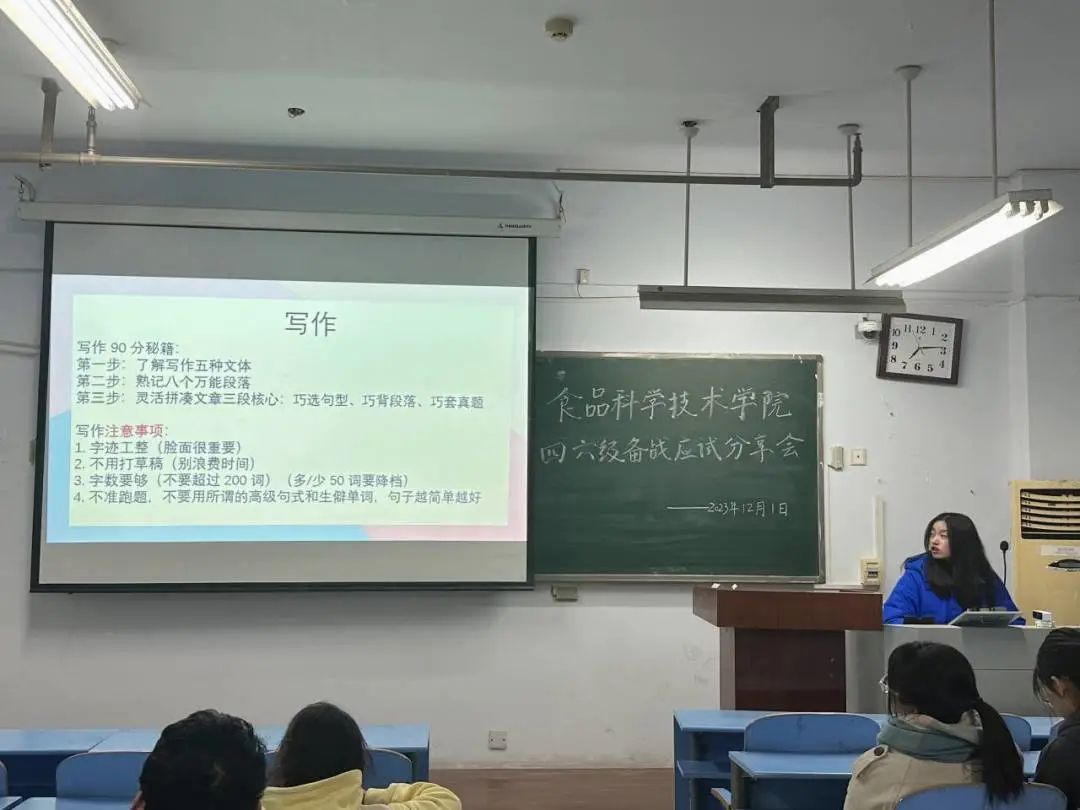 万俊莲根据自己备考四六级的经验,从听力、选词填空、写作等方面,向同学们详细地讲解了一些典型的四六级例题,同时,她向同学们分享了自己总结的写作模板,并留下了联系方式,她表示,同学们若有问题皆可向她咨询。