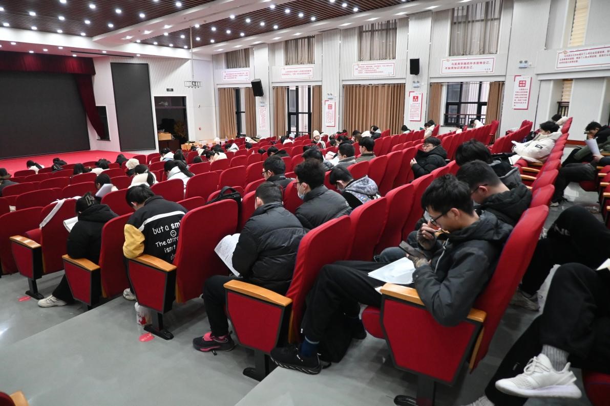 同学们在休息室或养精蓄锐,或专心复习,或与其他考生交流答题经验。志愿者们在休息室穿梭,为考研学子倒一杯热水、拿一个面包、送上一句衷心祝愿,他们用实际行动向每一位考生传递着温暖和力量。