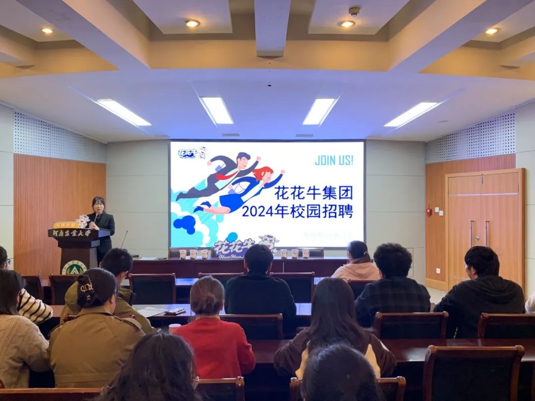 会议伊始,杨枫借花木兰替父从军这个历史故事,介绍了花花牛品牌名的渊源出处。并从公司概况、公司组织架构、产品介绍、哔咔漫画四方面展开叙述。她通过一些图片和事例详细地介绍了一瓶酸奶的生产过程,并表示,新鲜和安全是花花牛集团对顾客的承诺。随后,她讲述了员工发展通道、员工福利和人才需求等方面的内容,并鼓励同学们积极投简历,花花牛乳业集团欢迎同学们的加入。