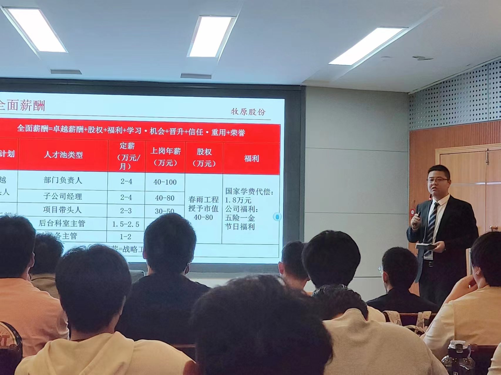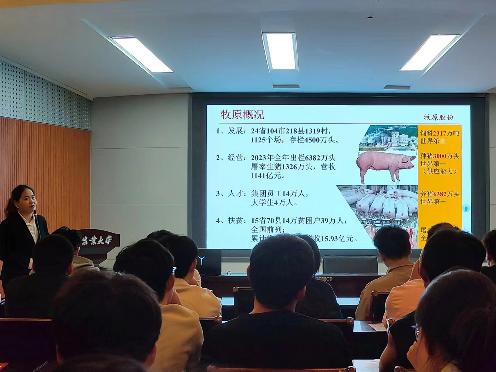 生产部高相重点介绍了肉食生产部,并从岗位职责和岗位方向两个方面向同学们展开介绍。他表示,肉食生产部致力于依靠自身实力,让大家吃上高品质的猪肉,为客户和社会创造实实在在的价值。