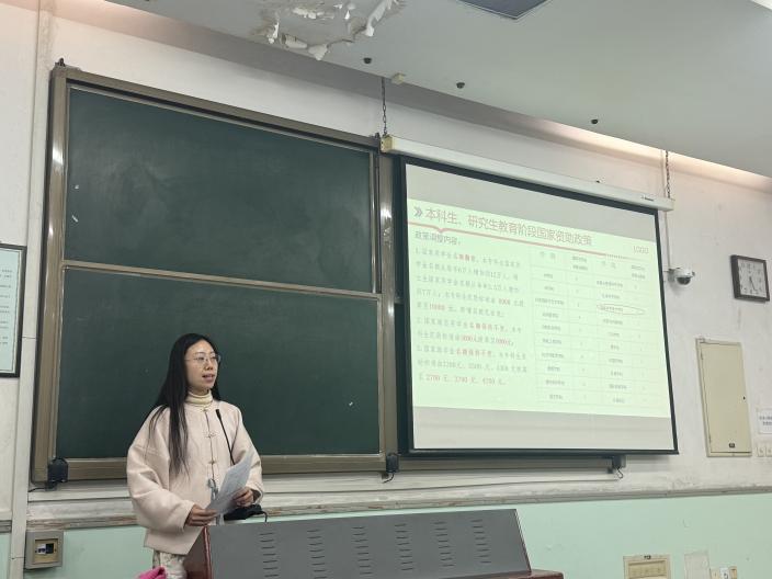 随后,她对奖助学金名额分配办法及评选标准作出详细说明,采取公平公开公正原则,由评议小组对候选人作出综合评定。同时,她鼓励每位同学积极进取、奋发向上。