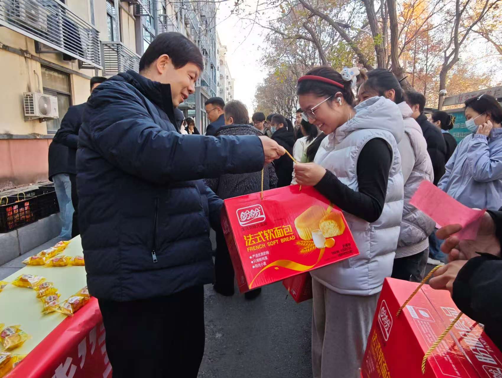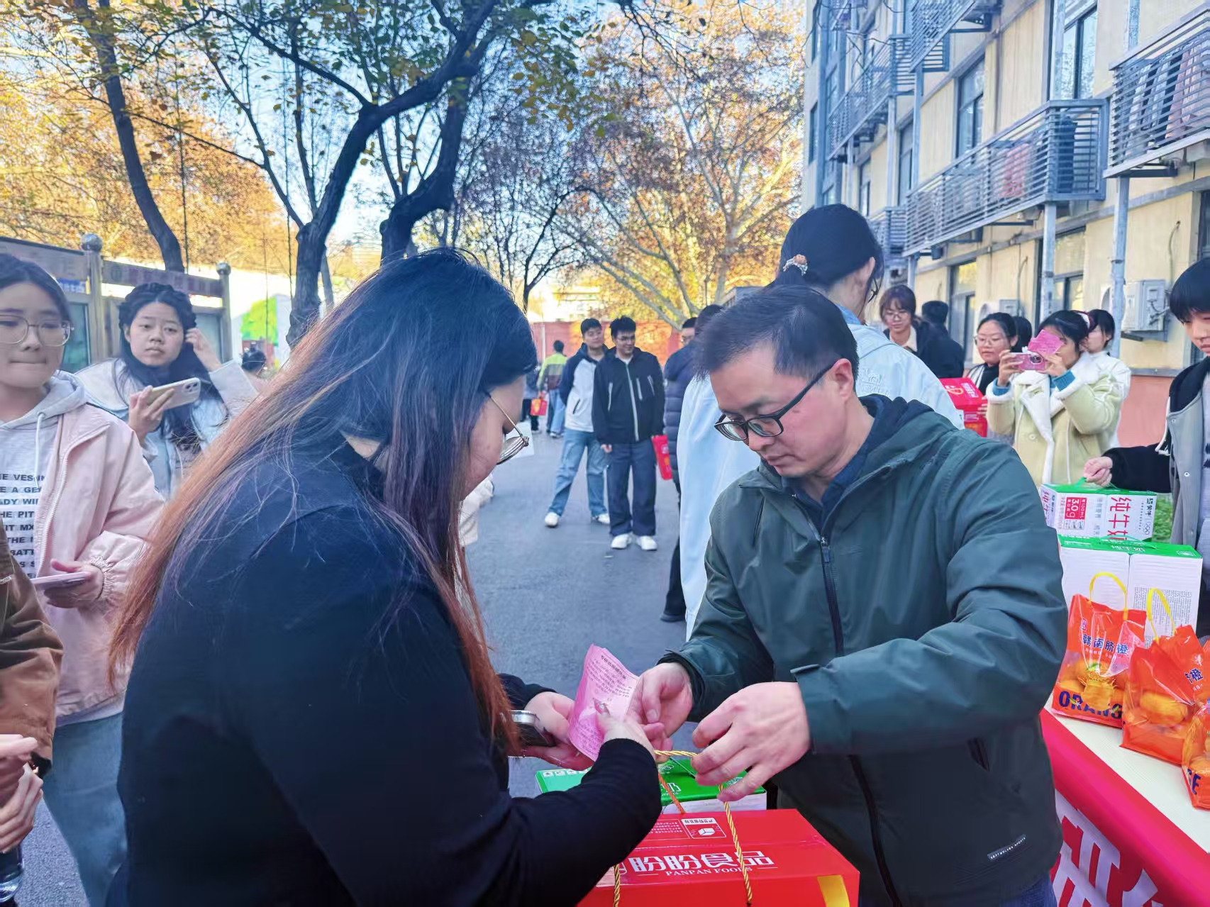 最后,领导老师们亲手为同学们送上了精心准备的暖心物资——新鲜饱满的橙子、松软可口的面包与营养醇厚的牛奶。一份份物资承载着学院对学子们的深切关怀与殷切期望,也传递着最真挚的祝福:愿同学们“橙”载梦想,乘风破浪;“包”揽知识,落笔生花;“牛”力加持,勇往直前!同学们接过这份沉甸甸的温暖,脸上绽放出灿烂的笑容,纷纷表示将把这份关怀转化为备考的动力,以更加昂扬的姿态投入到后续的复习中,不辜负学院的信任与期待。
