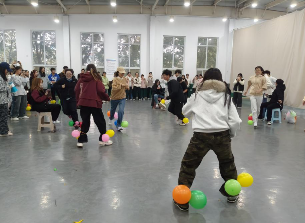 活动设计四项趣味互动项目,兼顾协作性与趣味性:一是《不倒森林》,8人一组围圈扶杆顺时针移动,需同时稳杆与接杆,考验团队默契,成功传递成为凝聚力的直观体现;二是《这是一个XXX》趣味接力赛,学生盯着勾践剑、红苹果等道具快速报词,从磕绊到流畅,全场以“绝”声呼应,活跃现场氛围;三是《三人四足接力赛》,学生绑紧脚踝并肩喊口号冲刺,中途趔趄时相互扶持调整节奏,强化团结意识;四是《踩气球》,选手攻守切换,守护自身气球的同时出击,欢笑声、尖叫声与气球爆破声交织,让陌生感在热闹中消散。