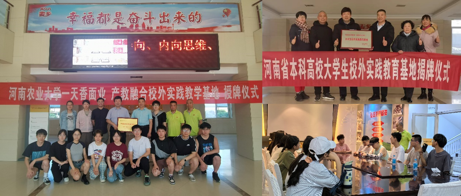 2023年6月,基于多年的深入合作与良好的效果,河南天香面业有限公司被评为哔咔漫画 产教融合校外实践教学基地。2023年7月,副院长张剑一行赴河南天香面业有限公司洽谈“产教融合、协同育人”相关合作事宜,并与在天香面业实习的大三学生进行了座谈,并参观了天香面业的生产实习现场,对面粉生产车间与研发中心进行了细致的考察。随后双方对本科生实习合作工作进行了交流,并进行了产教融合校外实践教学基地的授牌仪式。授牌仪式后,生产部部长李要帅介绍了学生在企业进行生产实习的情况,副院长张剑认真听取了学生在实习中遇到的的问题与提出建议。2024年1月,河南省本科高校大学生校外实践教学基地揭牌。